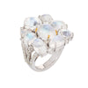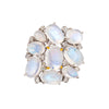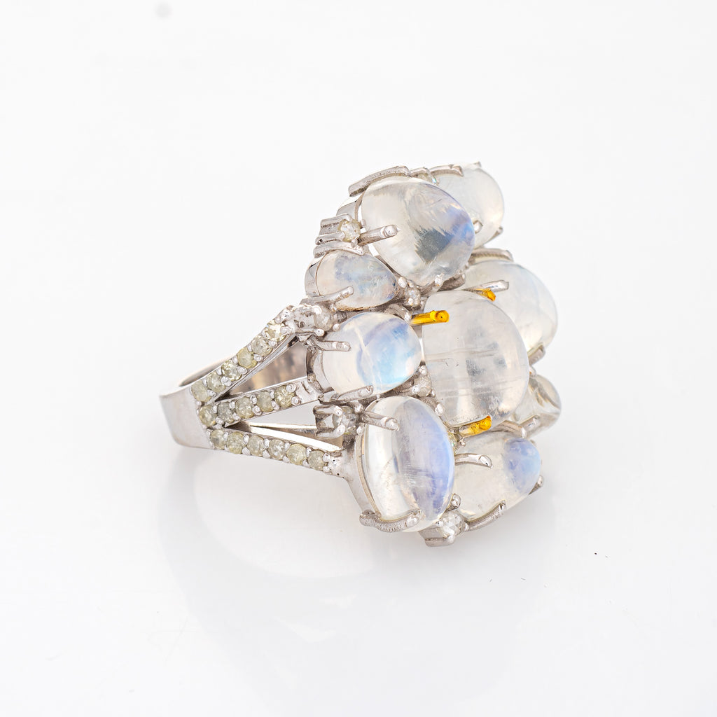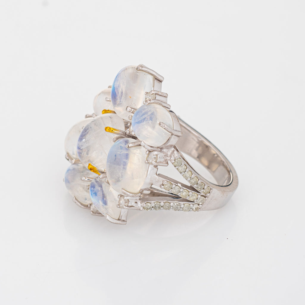 The luminous rainbow blue moonstones glow with every movement of the ring, set in a striking mosaic pattern. The cocktail is large in scale and makes a nice statement on the hand. The medium rise ring (11mm - 0.43 inches) sits comfortably on the finger.