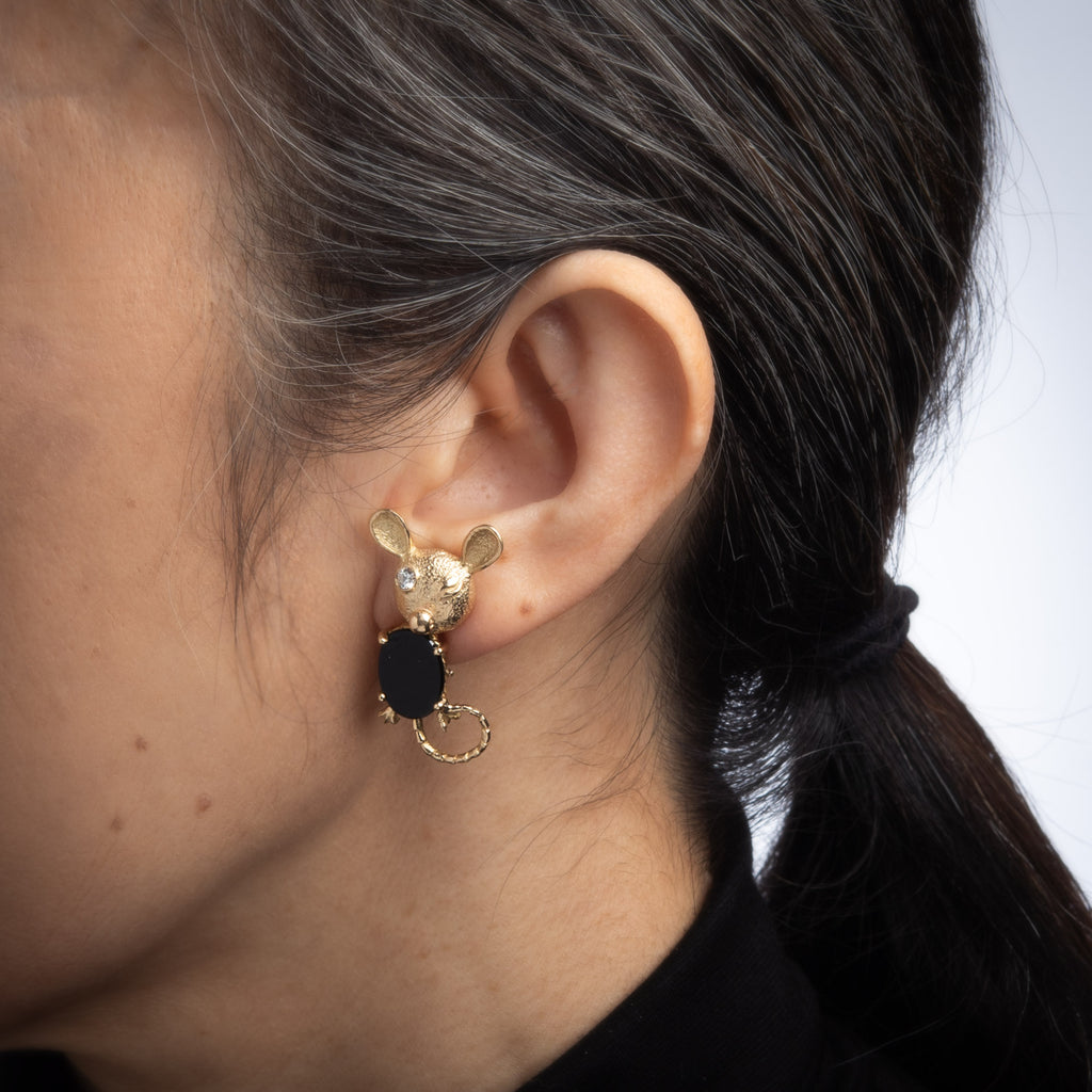 The whimsical mouse earrings offer a playful nod with winking eyes, large ears and curled tails. The earrings are large in scale and make a statement on the earlobe. The earrings are fitted with post & double hinged omega backings for pierced ears.