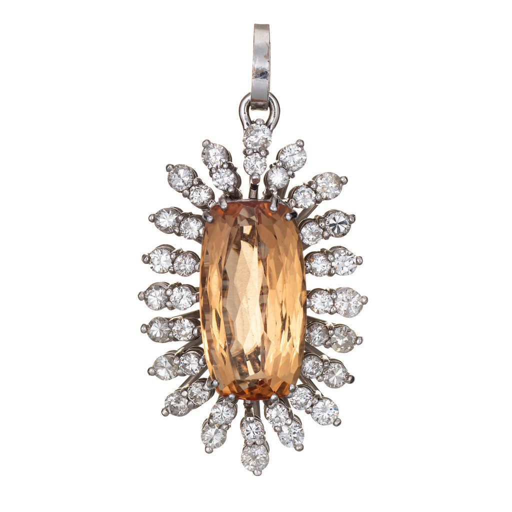 Forty full cut round diamonds, total weight apprx. 2.00ct, G-H/VS-I1 qualities, good cuts. The natural precious imperial topaz glows in the secure four pronged setting, flaked with 2 carats of shimmering diamonds. The statement piece is ideal worn alone or layered with your fine jewelry from any era.