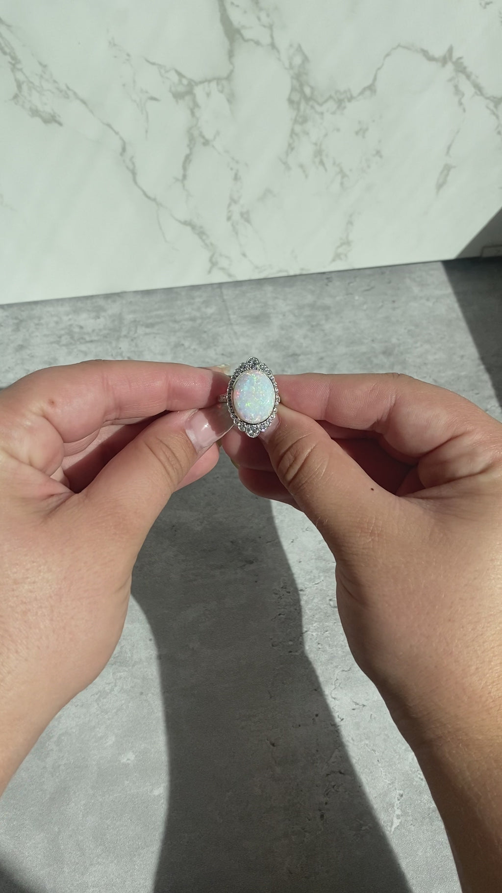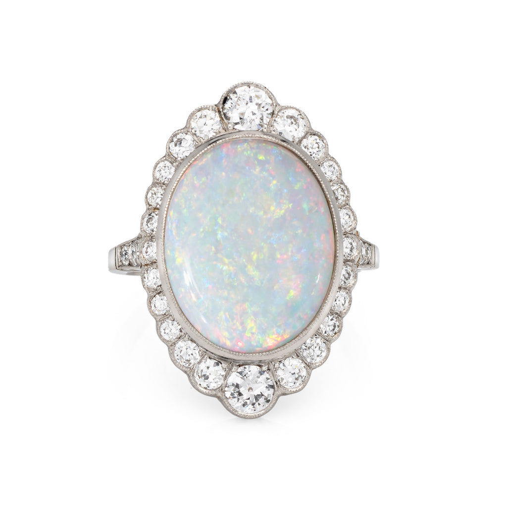 Stones: Natural opal measures 17mm x 13mm (estimated at 5.67 carats). The diamonds total an estimated 1 carat (estimated at H-I color and VS2-SI2 clarity). The opal is in excellent condition and free of cracks or chips.