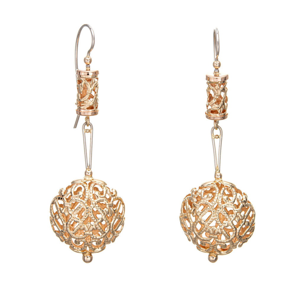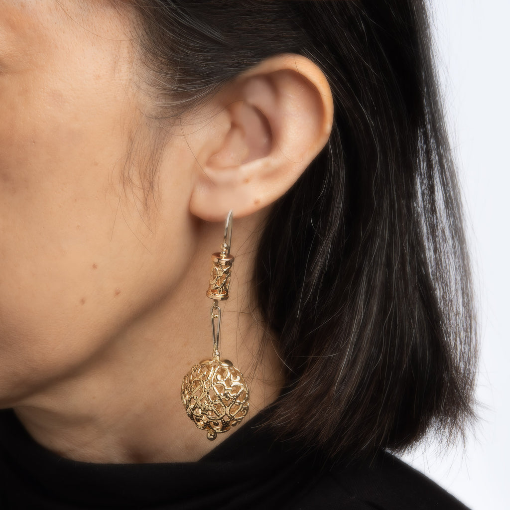 The long 3 inch earrings feature a large scrolled 1 inch orb to the base. The statement earrings make for a dramtic look for day or evening wear. The earrings are fitted with hook backings for pierced ears.