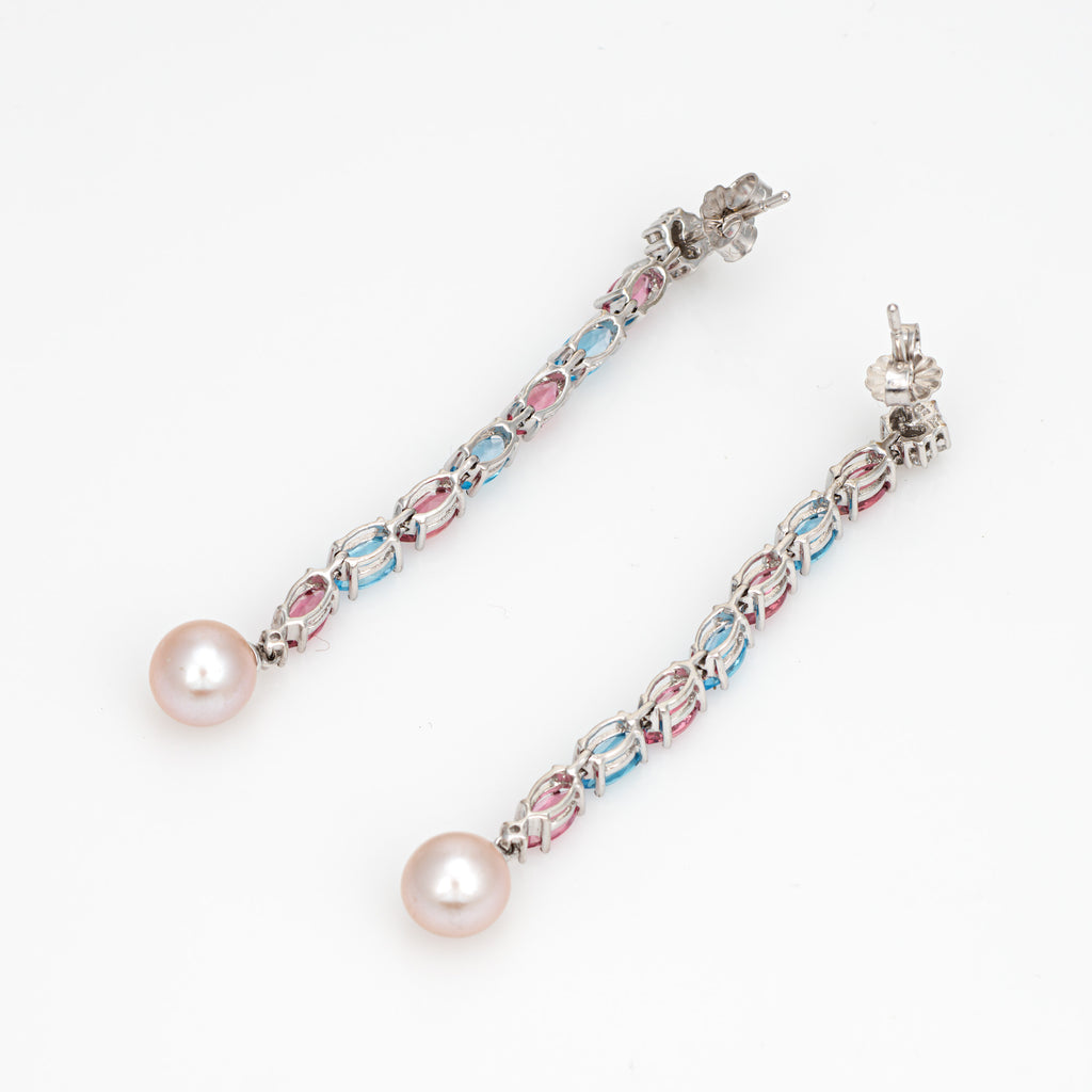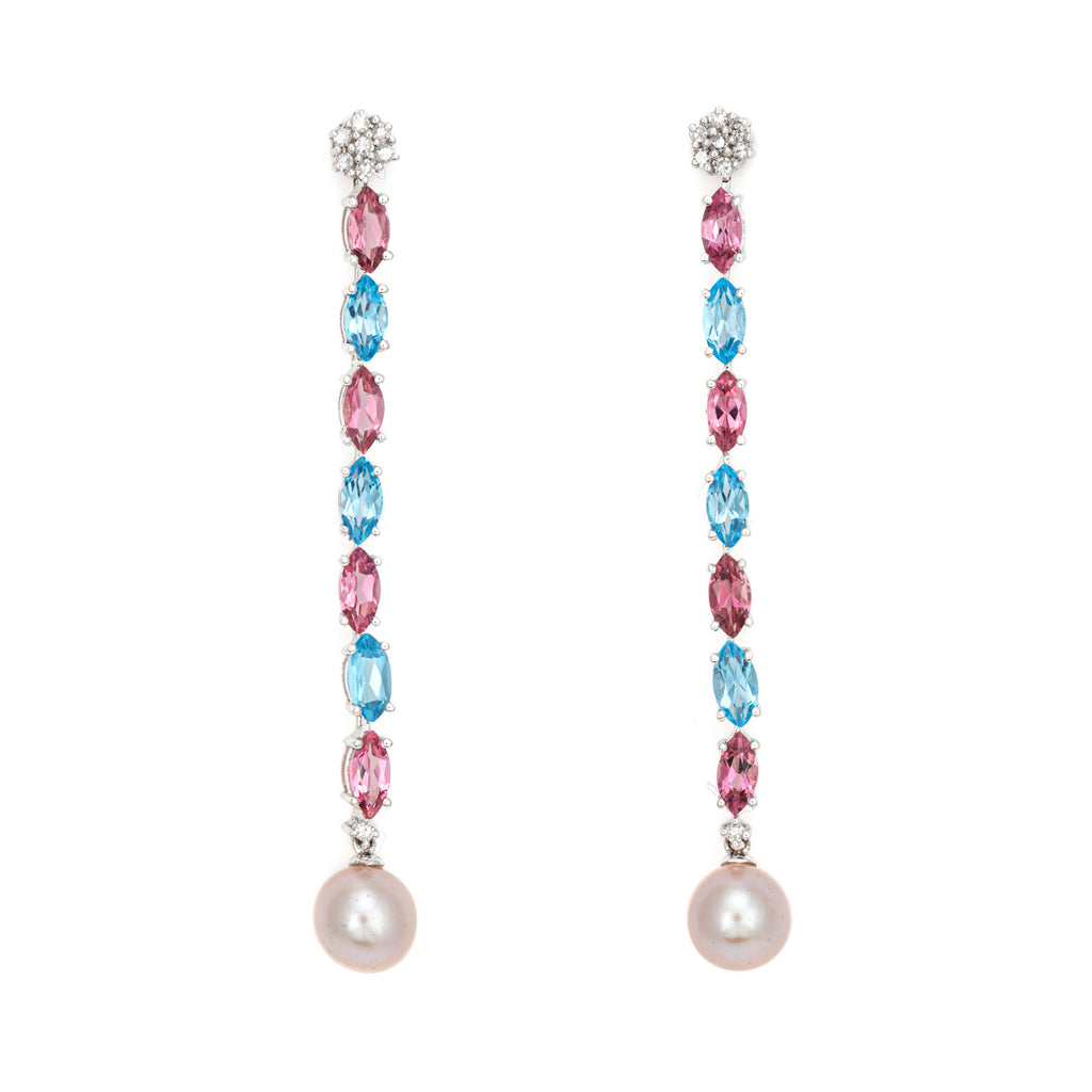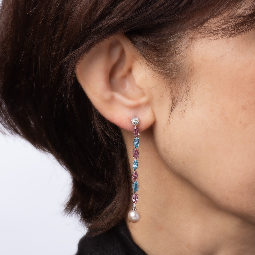 The long 2 1/4 inch drop earrings feature a lovely pop of color with the pink and blue topaz to the center, and a cluster of small diamonds to the top and cultured pearls to the base. The earrings are great for day or evening wear.