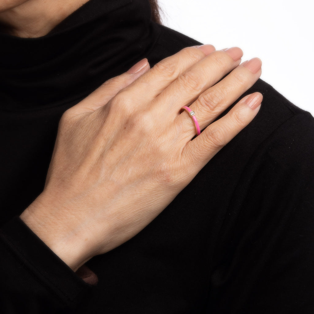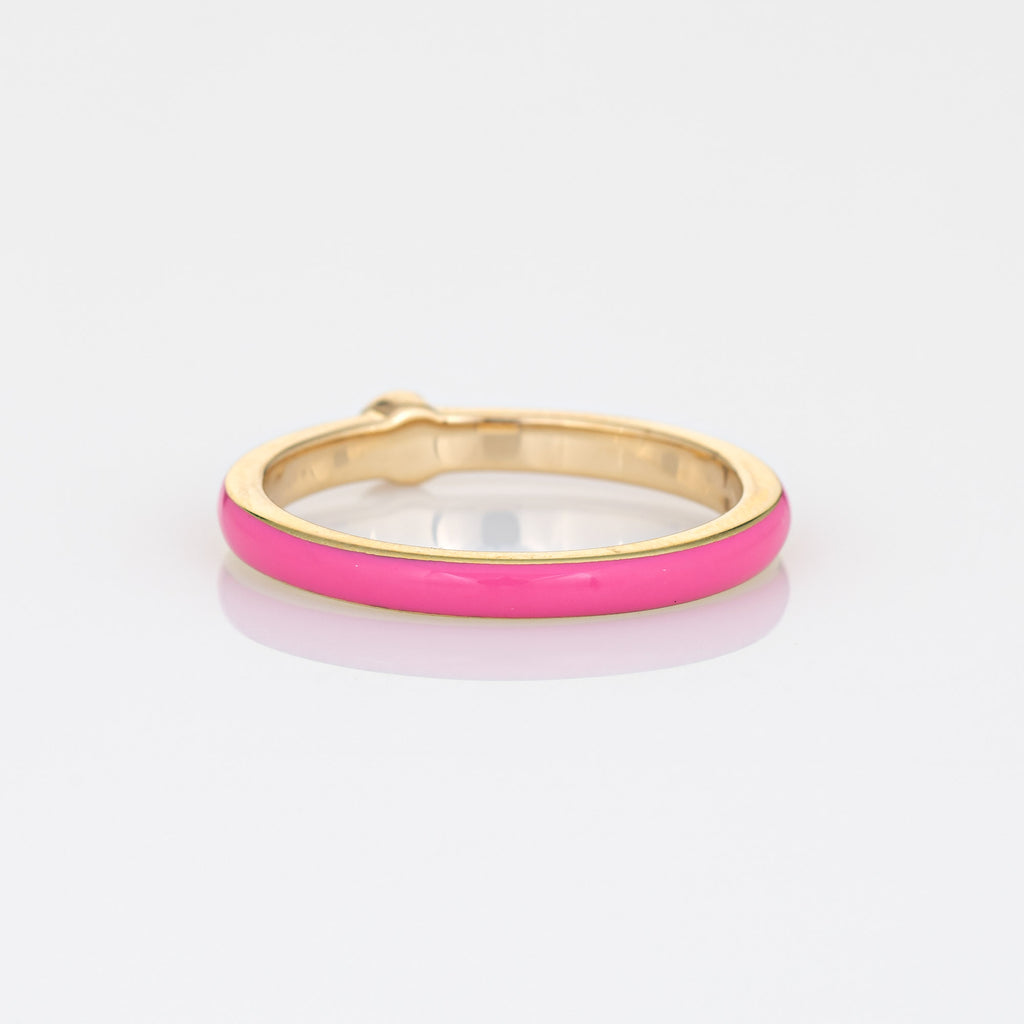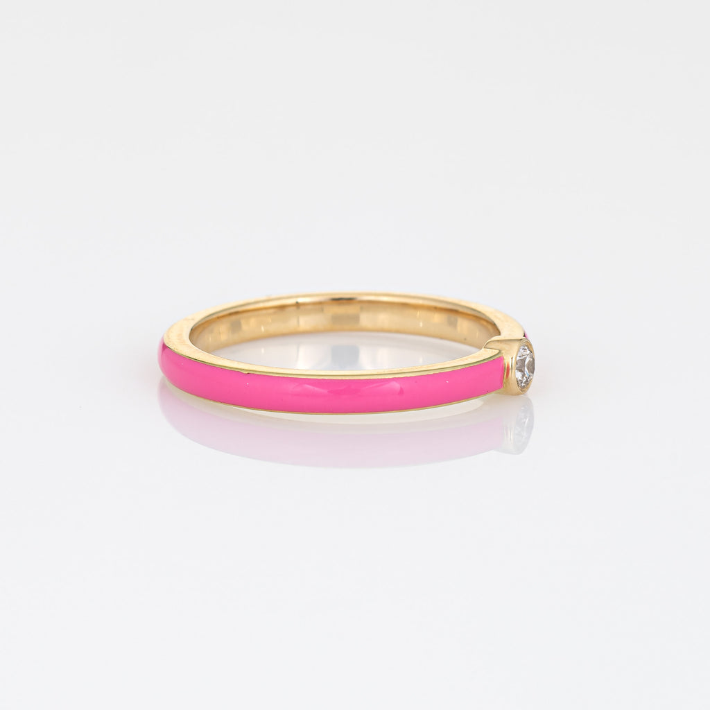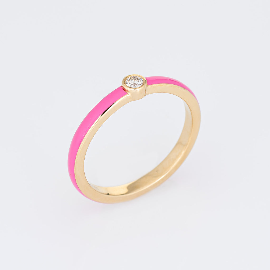 The enameled band is a striking pink color with a small diamond to the center of the band. The low rise ring (2mm - 0.07 inches) sits comfortably on the finger. Great worn alone or stacked with your fine jewelry from any era.