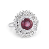 The tourmaline offers a deep pink hue surrounded with two tiers of diamonds in a princess style mount. The colorful ring is impactful in design and ideal worn day or night.