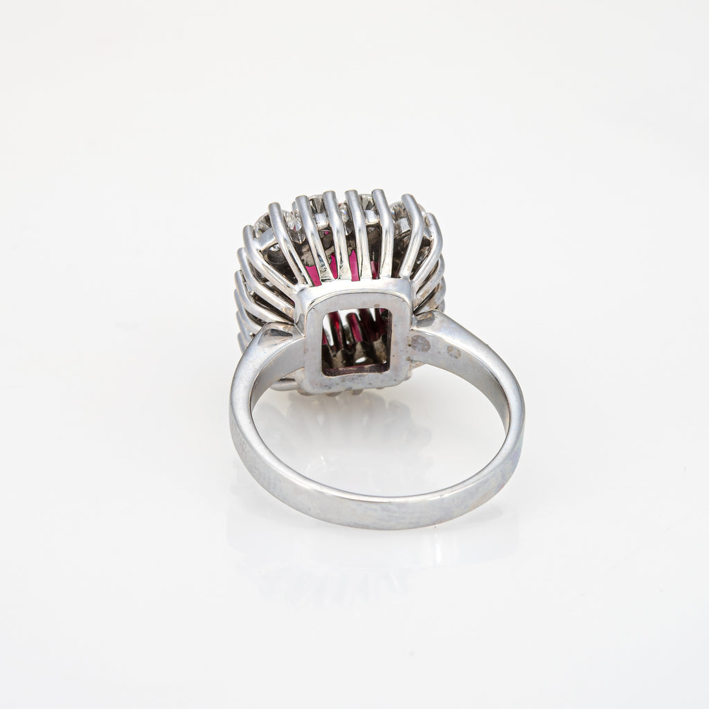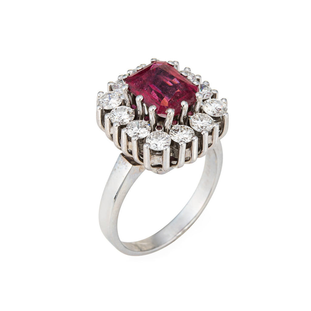 Stylish vintage pink tourmaline & diamond square cocktail ring (circa 1960s to 1970s) crafted in 900 platinum.