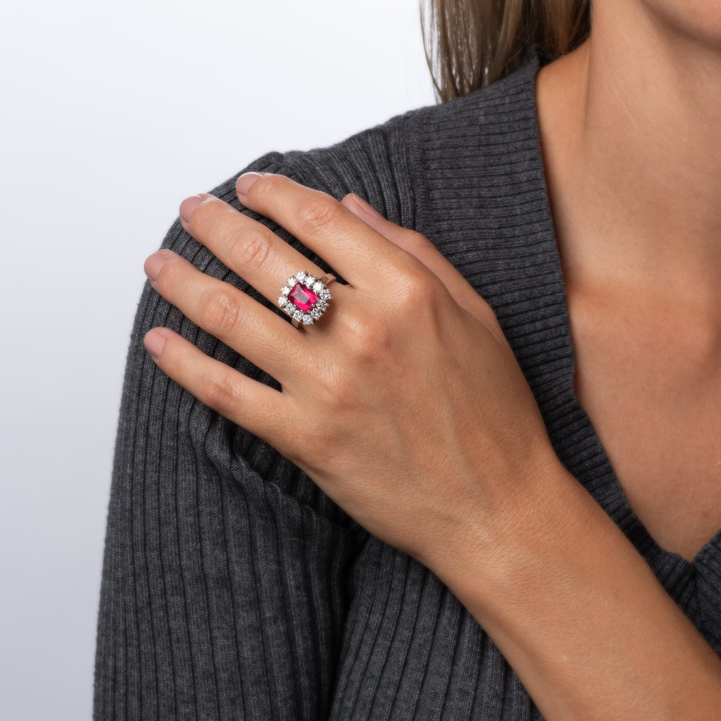 The warm pink tourmaline is surrounded with a halo of shimmering diamonds. As a cocktail ring, this piece is not just jewelry; it's a statement. The square design sets this ring apart from the more commonly found round and oval designs. The medium rise ring (12mm - 0.47 inches) sits comfortably on the finger. A glam ring for evening or a stylish daytime bauble.