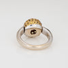 The bright and lively ring highlights a beautiful centrally mounted pink tourmaline, bordered with yellow sapphires and diamonds. The unique design of the ring allows the oval mount to move in 360 degree motion, with the ring sitting flat and comfortably on the finger. The ring has a low rise (7mm - 0.27 inches).
