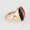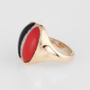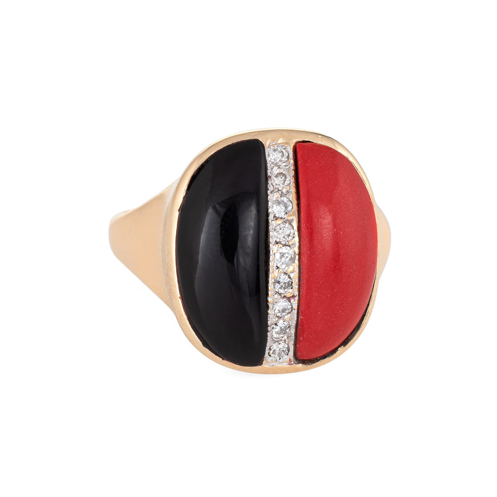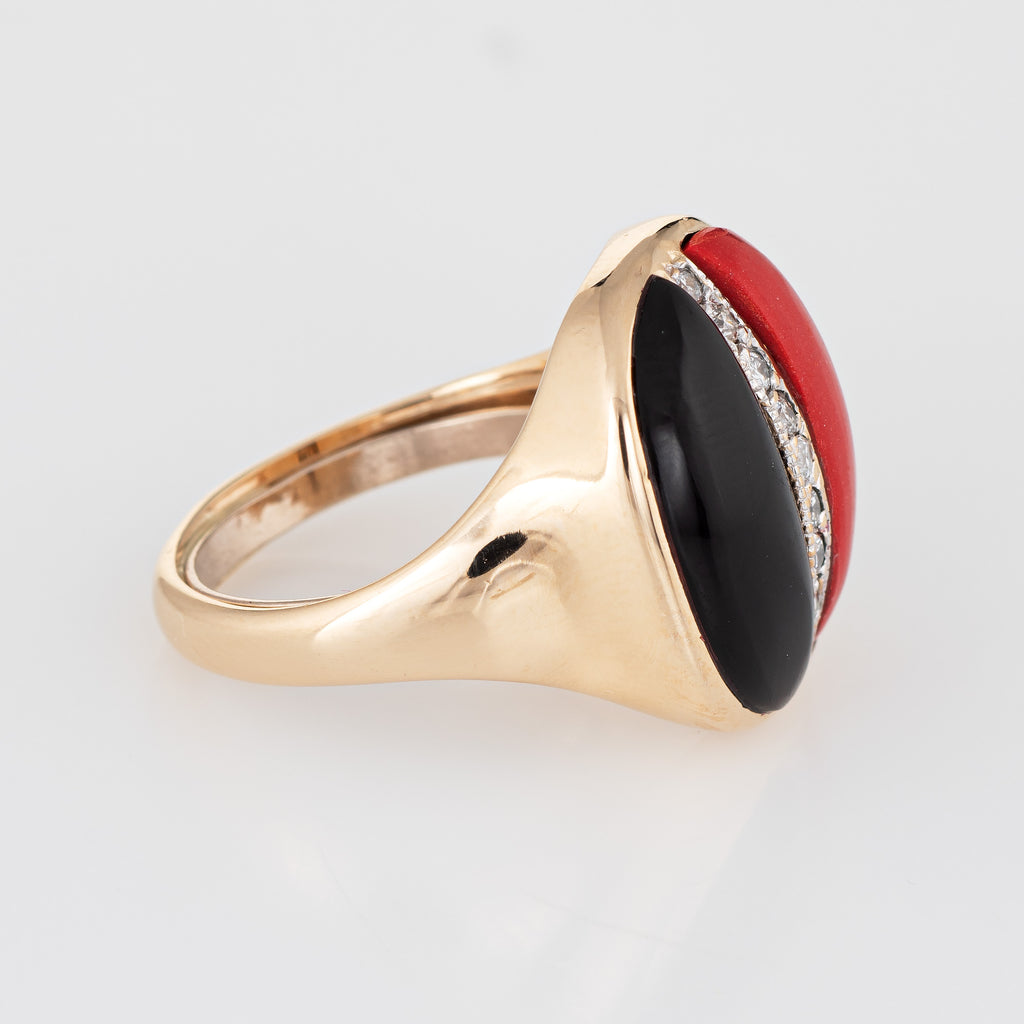 Stylish vintage coral, onyx & diamond cocktail ring (circa 1960s to 1970s) crafted in 14 karat yellow gold.