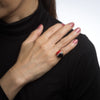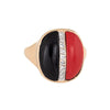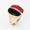 The combination of red coral and onyx is striking and unique. The strand of diamonds down the center add a touch of sparkle. The lower rise ring (5mm - 0.19 inches) sits comfortably on the finger. The colorful ring is impactful in design and ideal worn day or night.