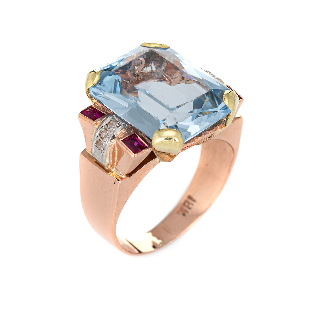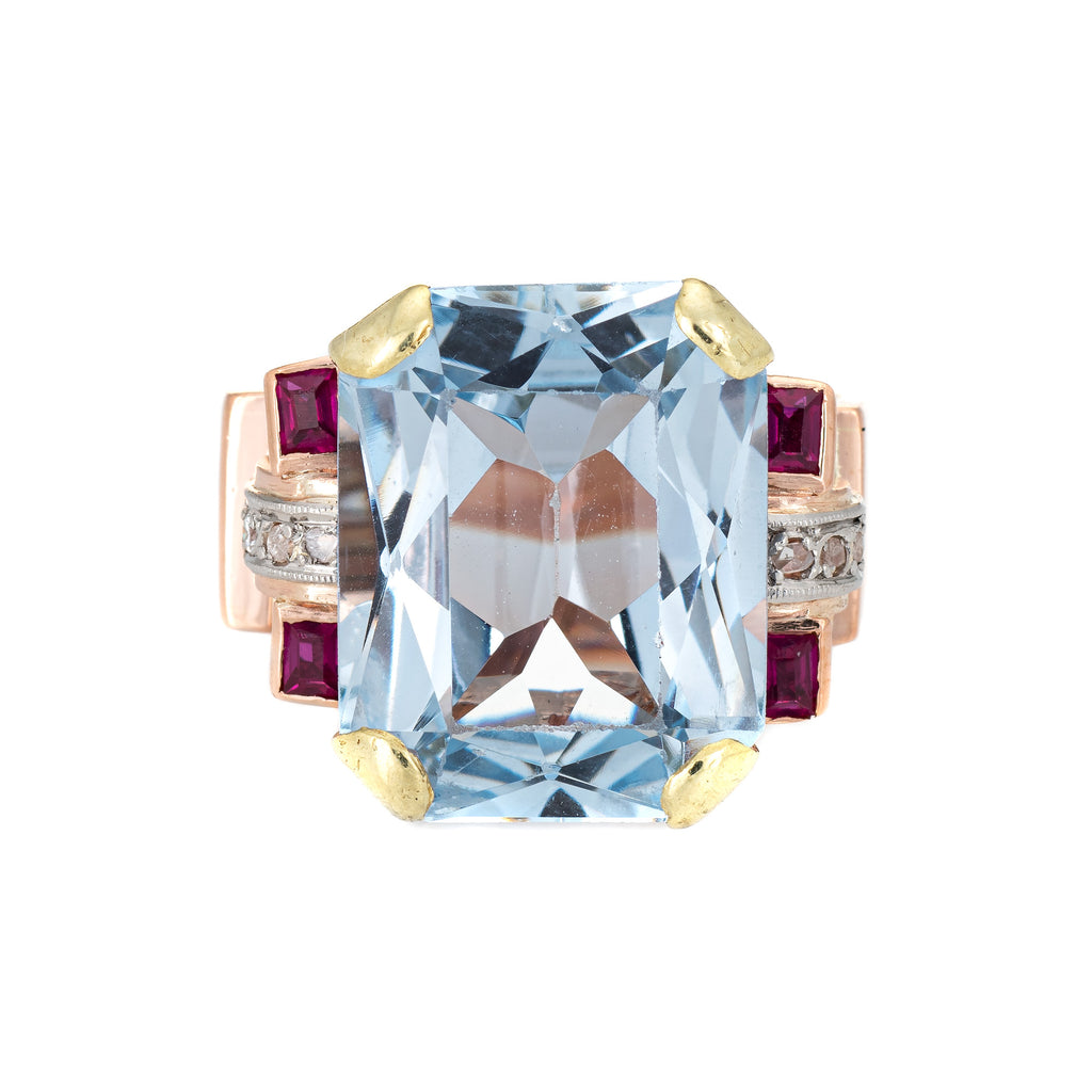 Stylish retro vintage blue topaz, ruby & diamond ring (circa 1940s) crafted in 18 karat rose gold.