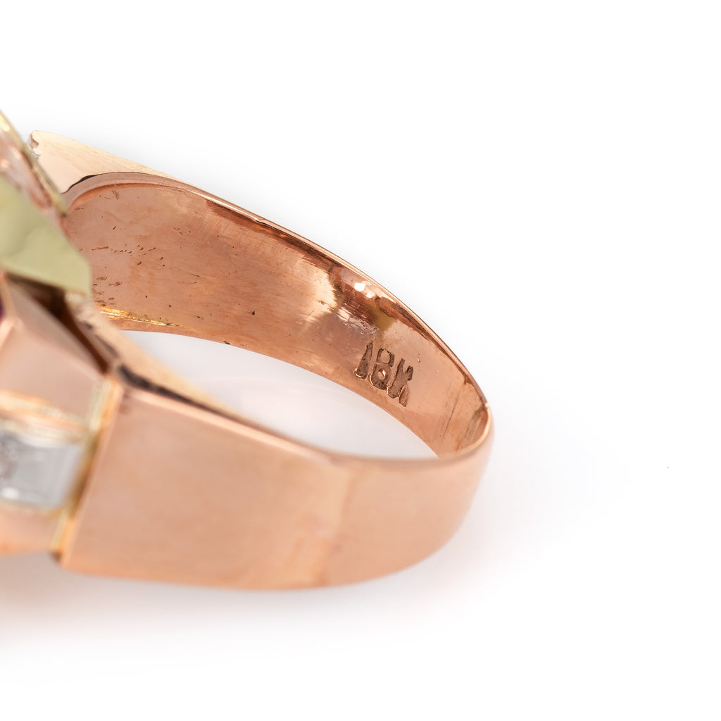 Metal & Hallmark: 18 karat rose gold. The ring is hallmarked "18k"