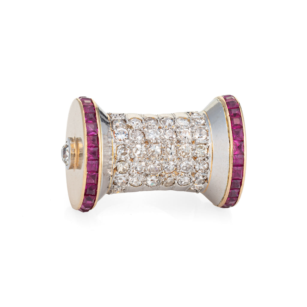 Stylish vintage barrel cocktail ring (circa 1940s to 1950s) crafted in 18 karat yellow gold and platinum.
