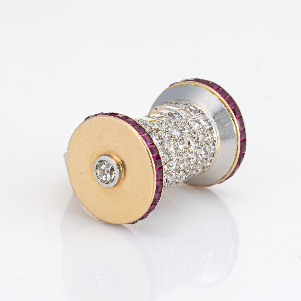 Stones: Single cut & old European cut diamonds total an estimated 1.40 carats (estimated at I-J color and VS2-SI2 clarity). The square cut lab created rubies measure approx. 1.5mm each (light surface abrasions visible under a 10x loupe).