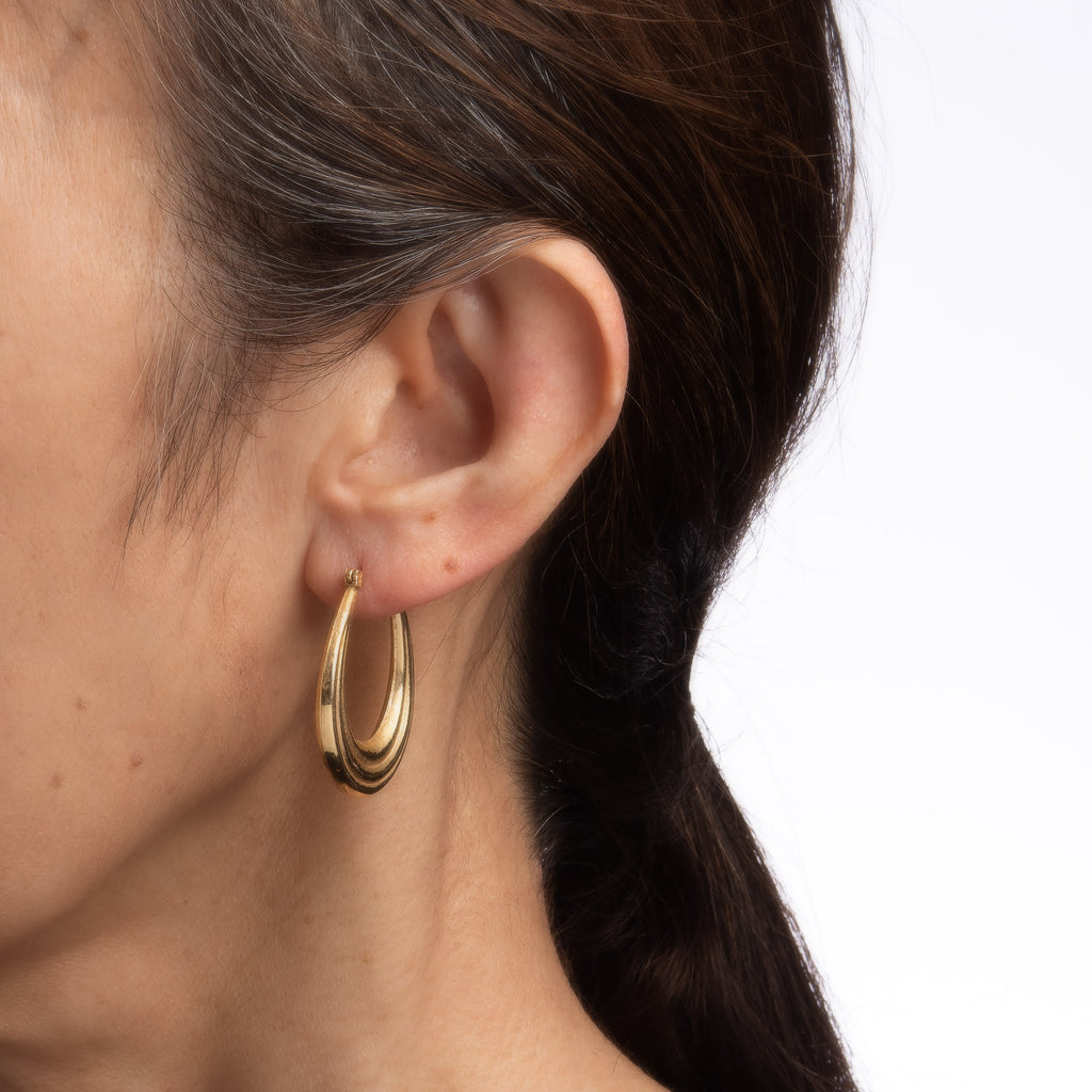 The stylish earrings feature a ridged design. The hollow earrings offer a lightweight feel for a comfortable fit on the earlobe. The earrings are fitted with post backings for pierced ears.