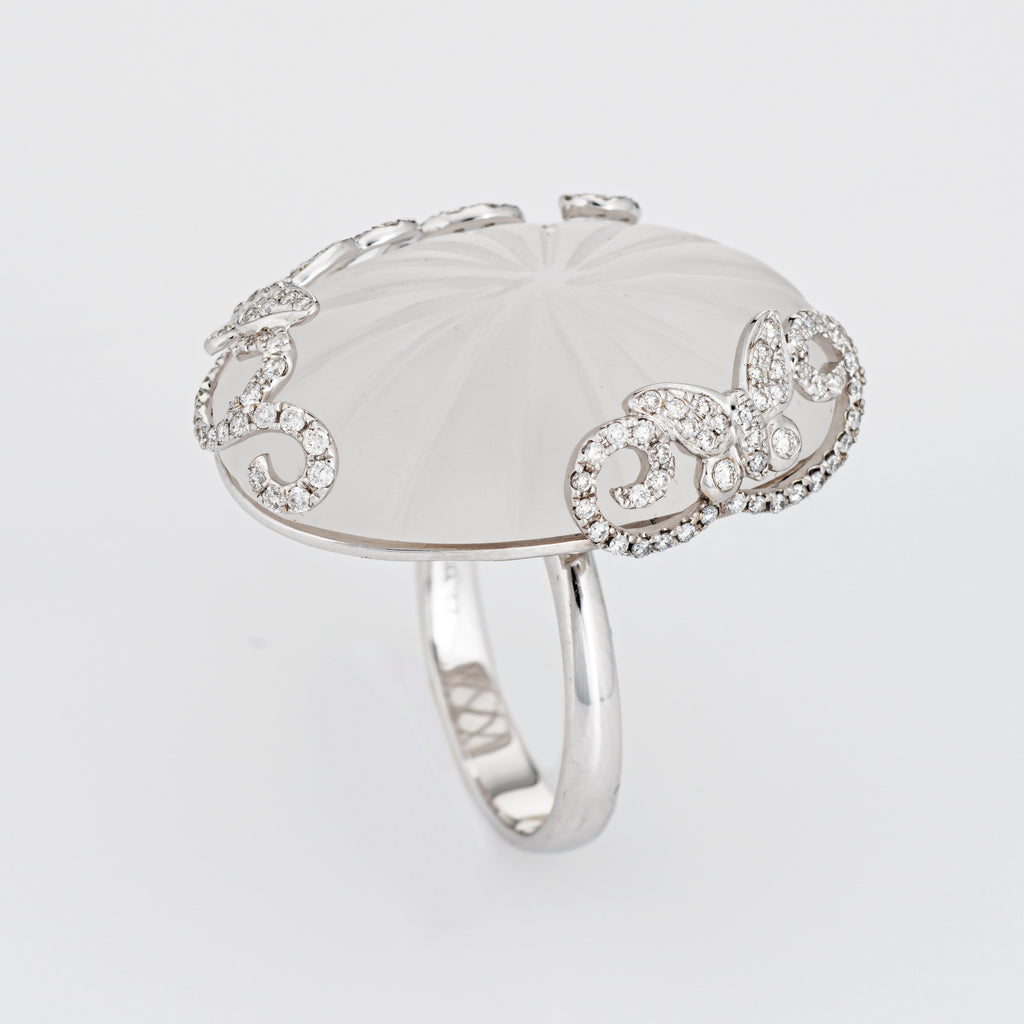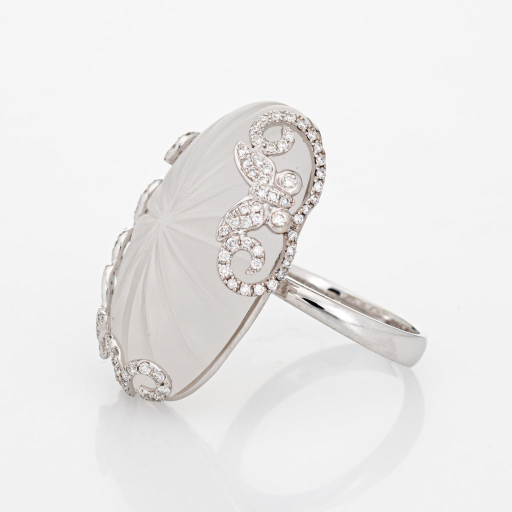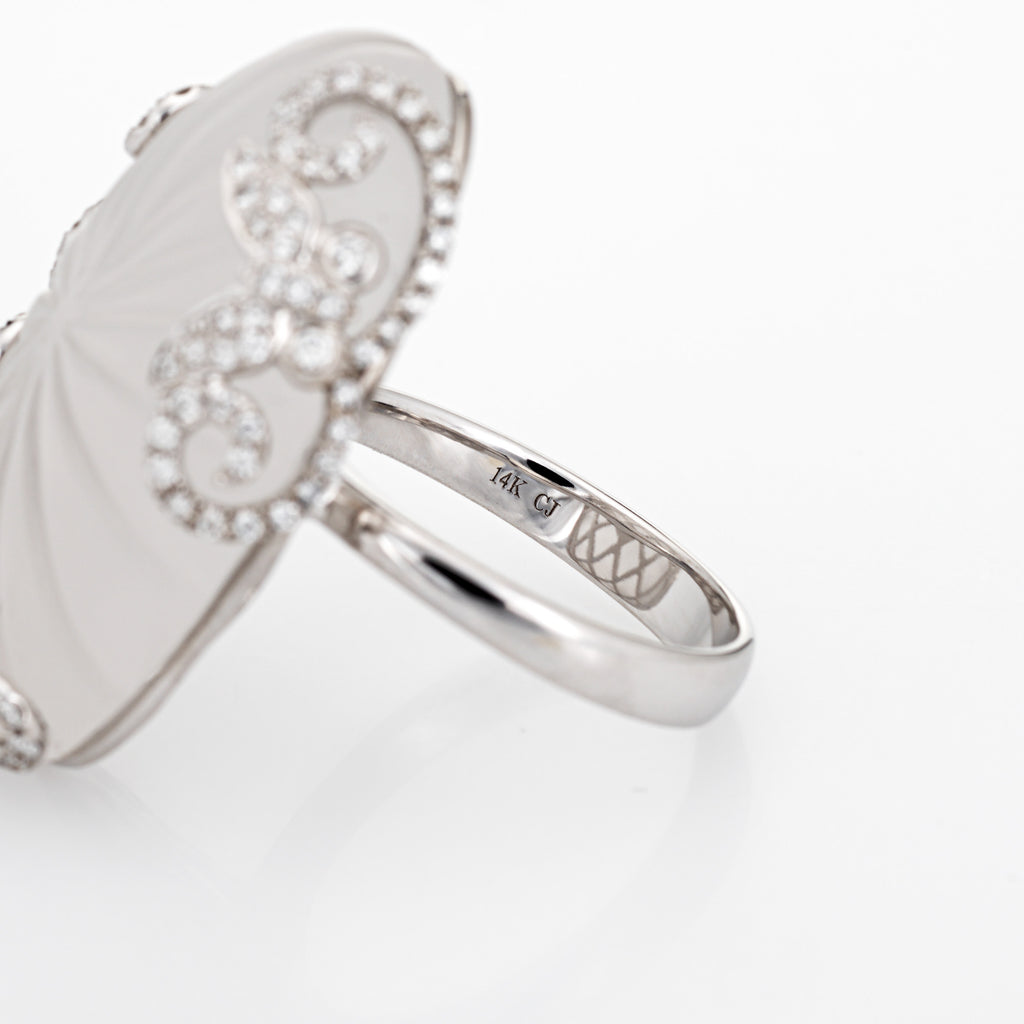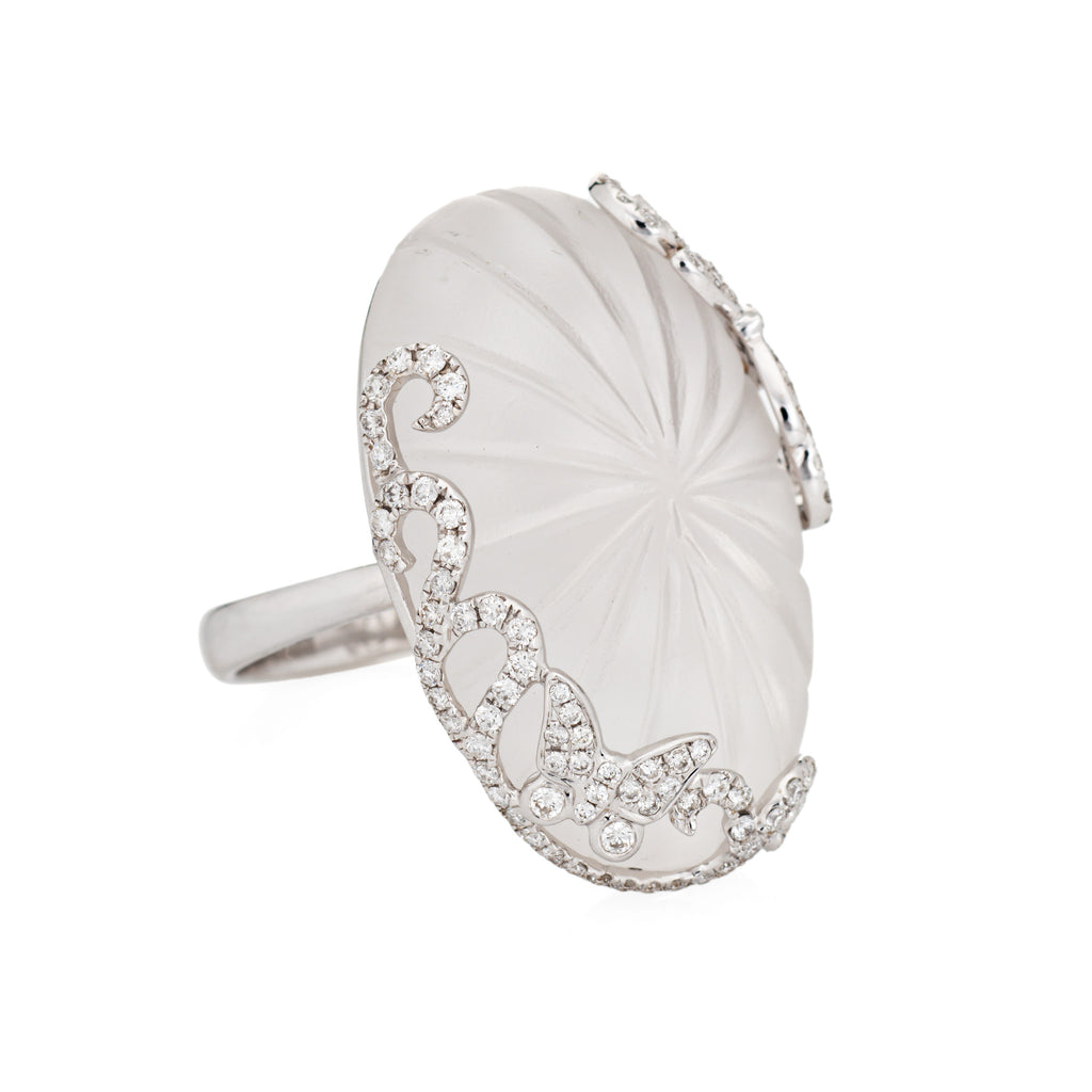 The luminous rock crystal features an etched starburst design, with diamond set butterflies to both sides. The ring has a wonderful ethereal quality and great for day or evening wear. The cocktail ring makes a nice statement on the hand. The medium rise ring (10.5mm - 0.41 inches) sits comfortably on the finger.