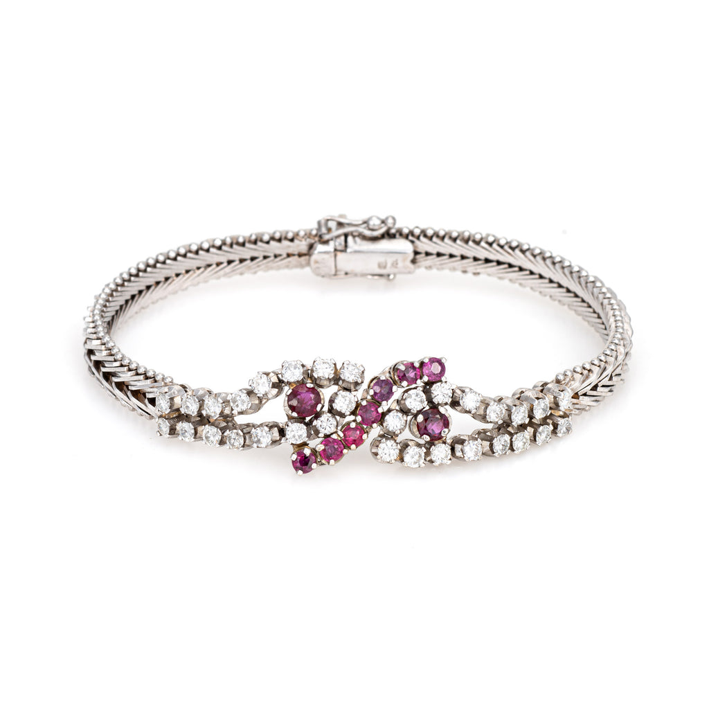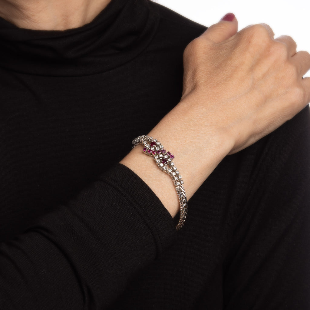 Stylish and finely detailed diamond & ruby bracelet crafted in 18 karat white gold (circa 1950s).