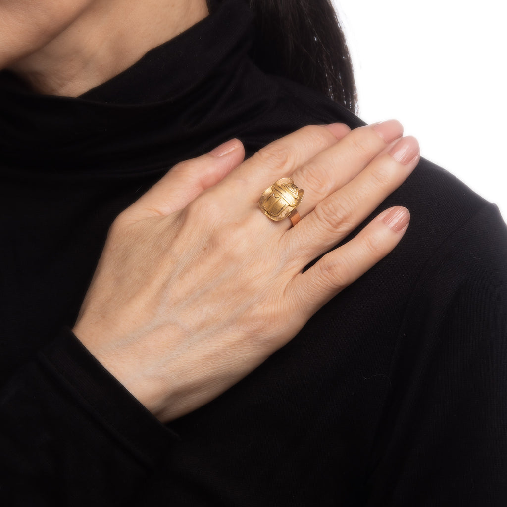The nicely detailed scarab beetle sits perched on the mount. The scarab represents the cycle of birth, life, death and resurrection. The ring makes a nice statement on the hand. The low rise ring (6mm - 0.23 inches) sits comfortably on the finger.