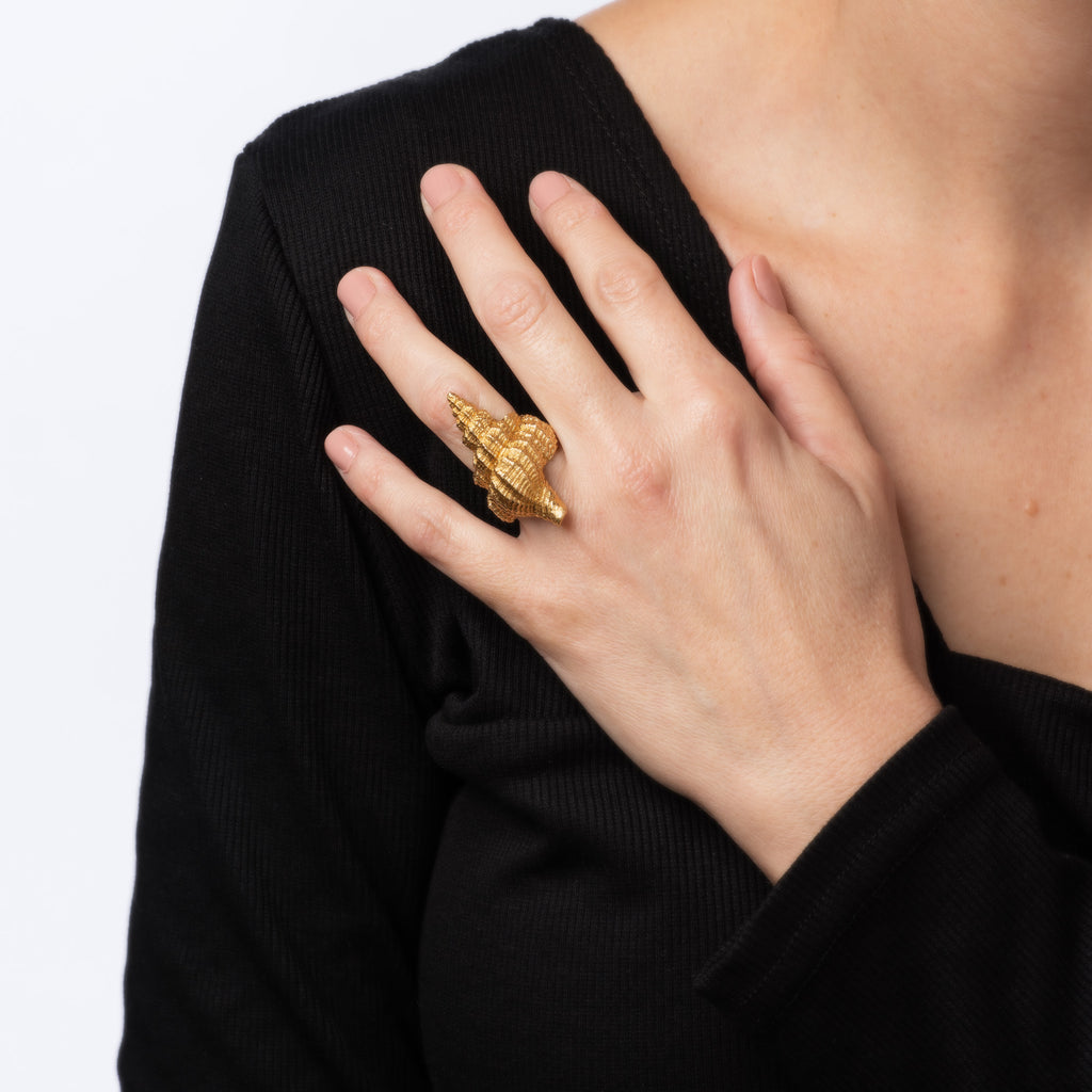 Rendered in lifelike detail, the beautifully detailed seashell makes a great statement on the hand. Measuring 1 1/2 inches in length the ring is designed as a cuff ring (it can be resized up or down approx. 1-2 sizes). The medium rise ring (10mm - 0.39 inches) sits comfortably on the finger.