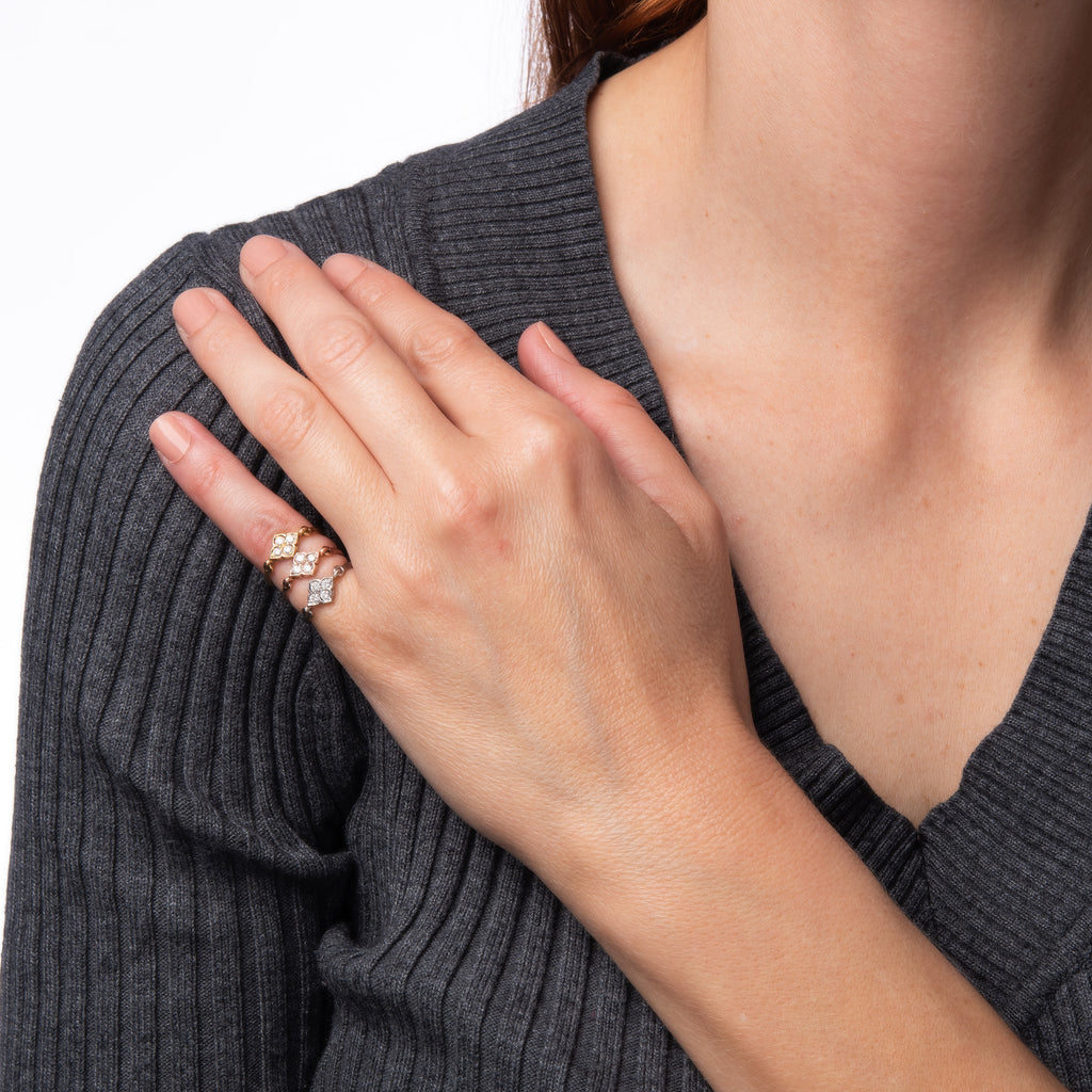 The out of production Cartier rings feature a floral motif. Quite a rare find as a set of 3, the rings are typically found as a single ring. The rings are petite in scale and are great worn alone or layered with your fine jewelry from any era. Makes a fun stack on the pinky finger!