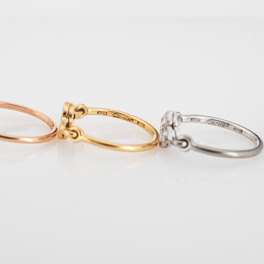 Metal & Hallmark: 18k white, rose and yellow gold. The white and yellow gold rings are hallmarked "750" for 18 karat gold and "Cartier" along with the serial number and the ring size "45"