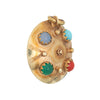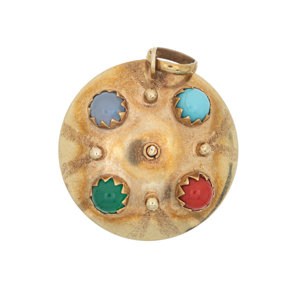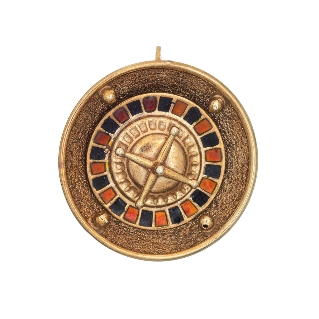 Finely detailed vintage gemstone set roulette wheel charm crafted in 14k yellow gold (circa 1960s to 1970s)