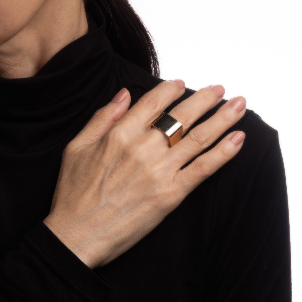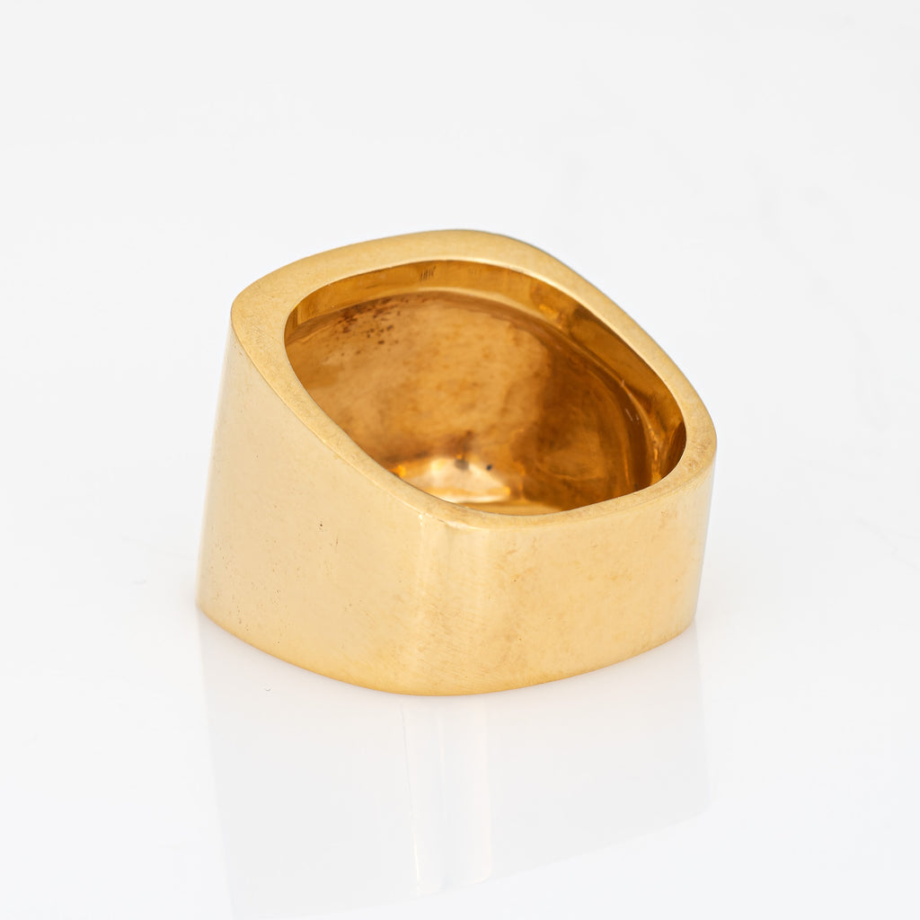 The beautifully crafted ring highlights a distinct square design. The ring has a weighty feel (19.5 grams) and makes a great statement on the hand. The wide band (17mm - 0.66 inches) is great worn alone or stacked with your fine jewelry from any era. The low rise ring (2.5mm - 0.09 inches) sits flat and comfortably on the finger.