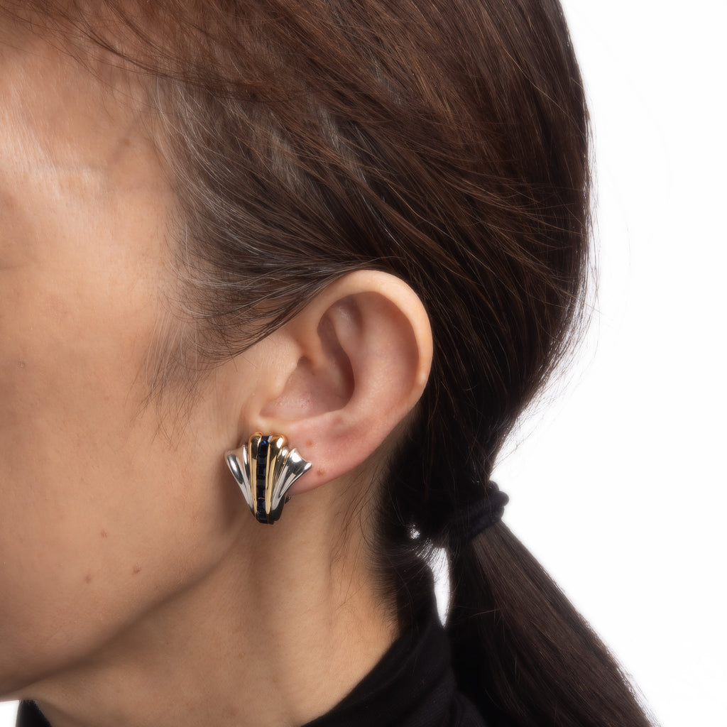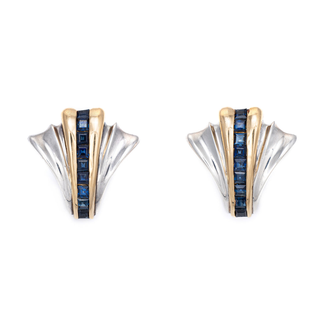 The beautifully detailed earrings are designed in the Art Deco style, with a strand of blue sapphires channel set to the center. The retired earrings are no longer available for sale at Tiffany & Co. The scalloped style earrings are fitted with double hinged omega backings for non-pierced or pierced ears.