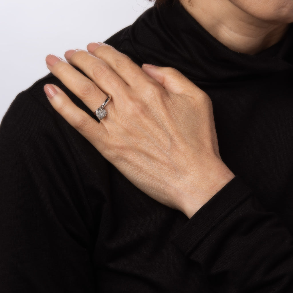 The stylish ring features a diamond set heart, suspended from the band to allow for movement. The ring is impactful in design and ideal worn day or night. The ring was originally available at Tiffany & Co approx. ten years ago and has since been retired from retail.
