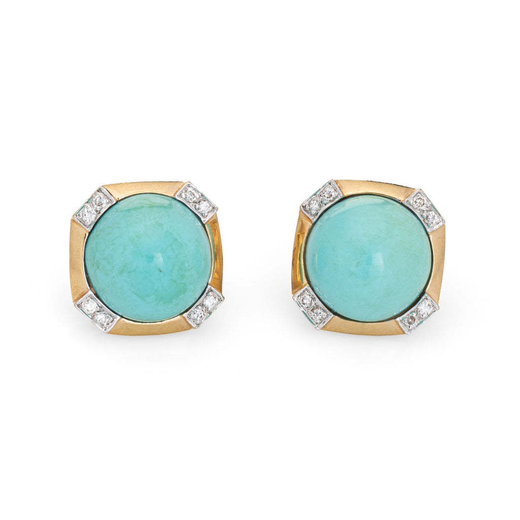 Stones: Two cabochon cut pieces of persian turquoise measures 14.5mm (each), accented with an estimated 0.16 carats of diamonds (estimated at H-I color and SI1-2 clarity). The turquoise is in excellent condition and free of cracks or chips.