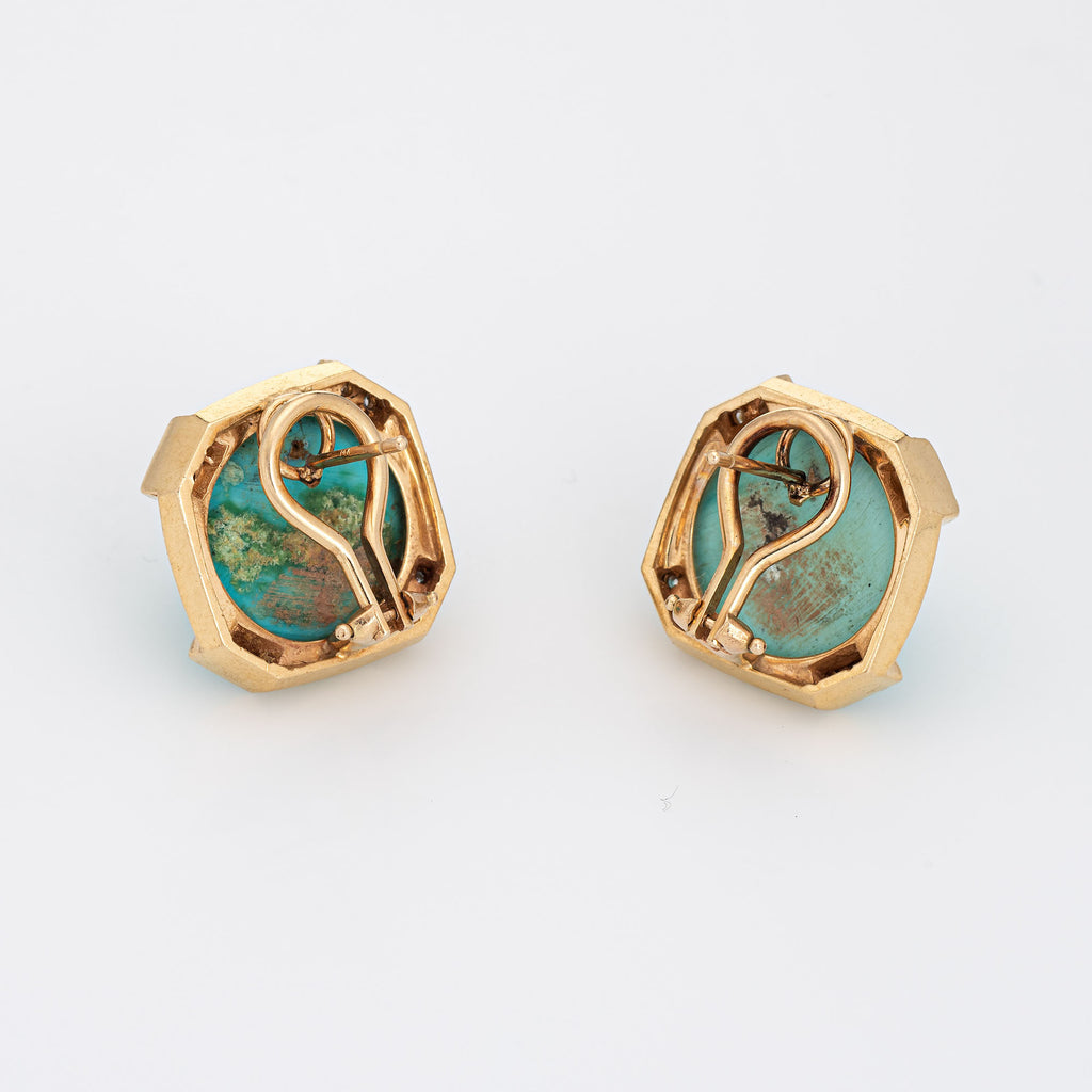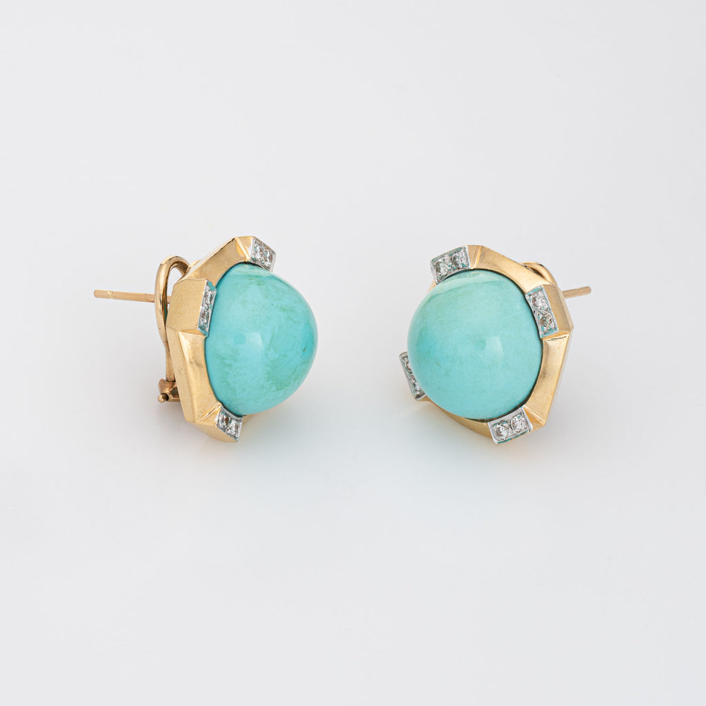 Elegant pair of vintage persian turquoise & diamond earrings (circa 1960s) crafted in 14k yellow gold.