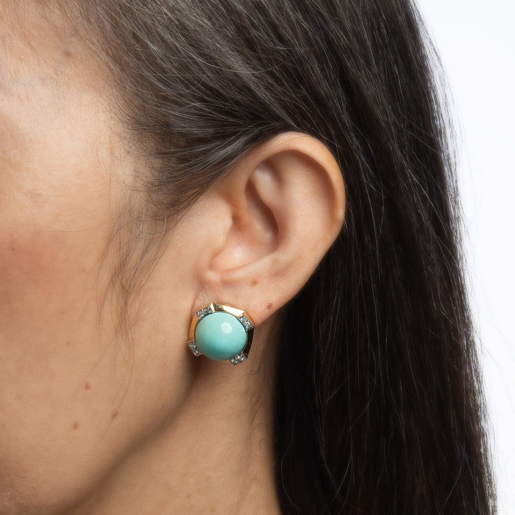 Two cabochon cut pieces of persian turquoise measures 14.5mm (each), accented with an estimated 0.16 carats of diamonds (estimated at H-I color and SI1-2 clarity). The turquoise is in excellent condition and free of cracks or chips.