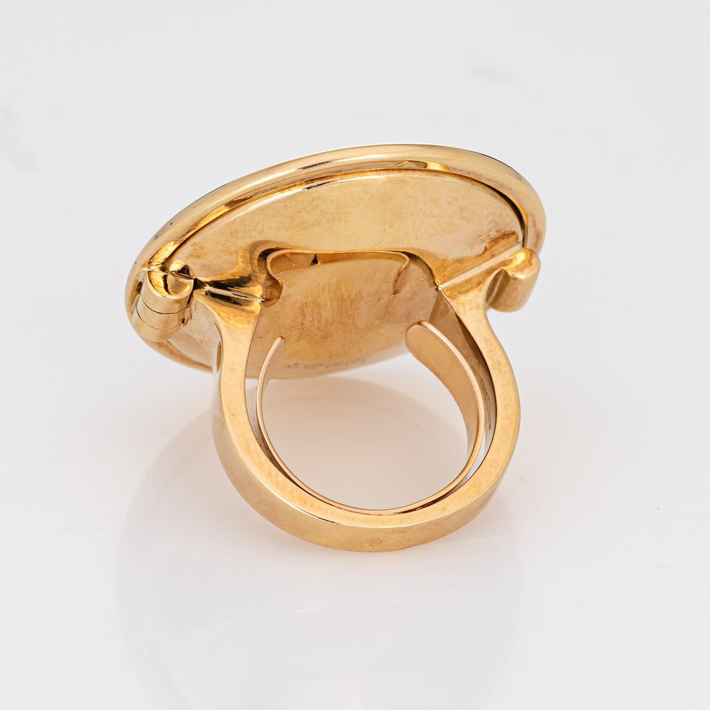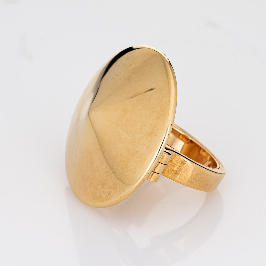 Timeless and oh so chic, the "Chapeau Chinois" collection by Van Cleef & Arpels was originally created in 1931 for the Paris Exposition Coloniale Internationale, a fair that highlighted diverse arts and cultures. Van Cleef & Arpels, ever so ingenious, transformed a traditional Chinese hat to form the collection of bold, high polished and timeless jewels. The collection was re-launched in 2000 with the ring (the matching bracelet is also available for sale) belonging to the later revival series. The ring opens to accommodate a photo or keepsake. The medium rise ring (11mm - 0.43 inches) sits comfortably on the finger, a great ring for day or evening wear.
