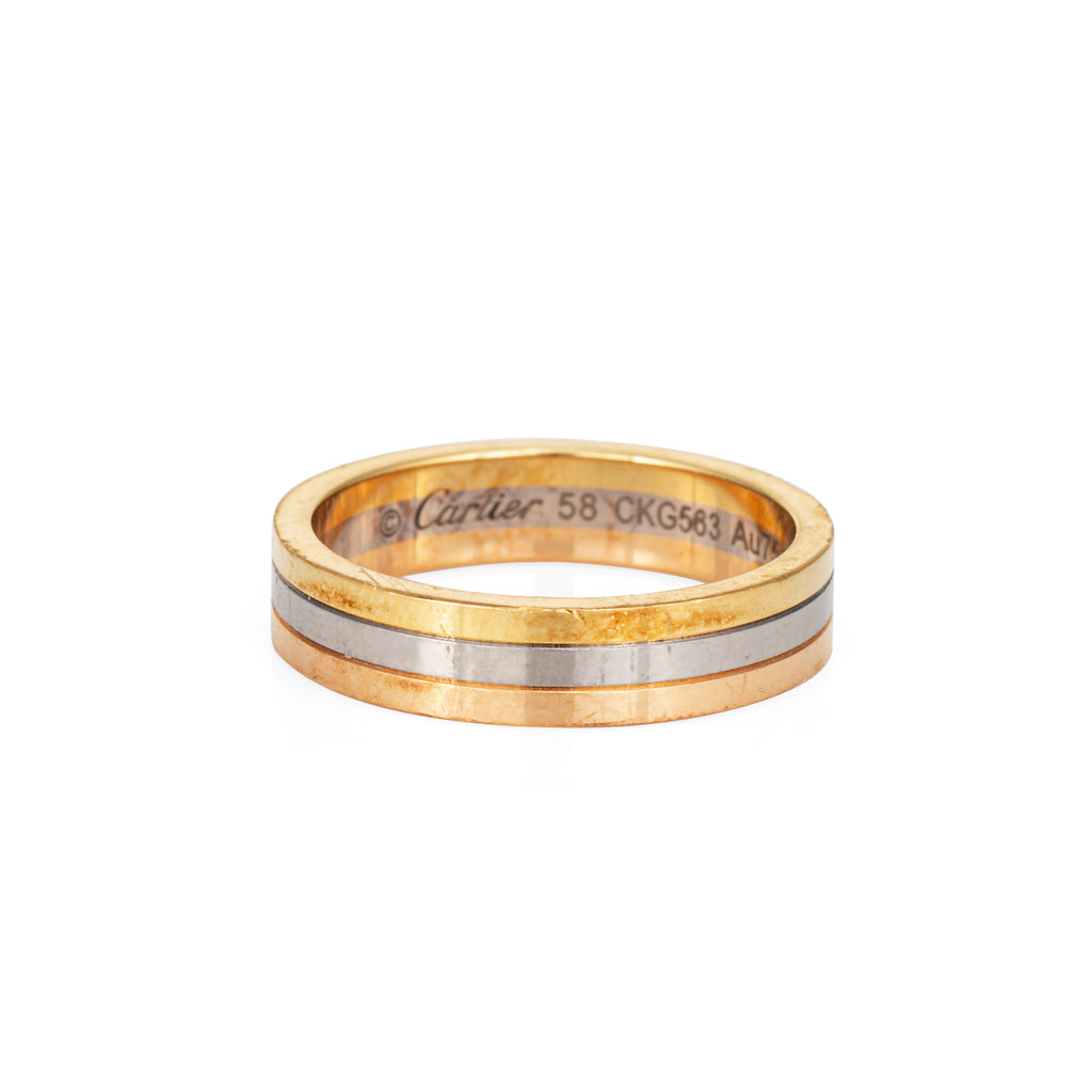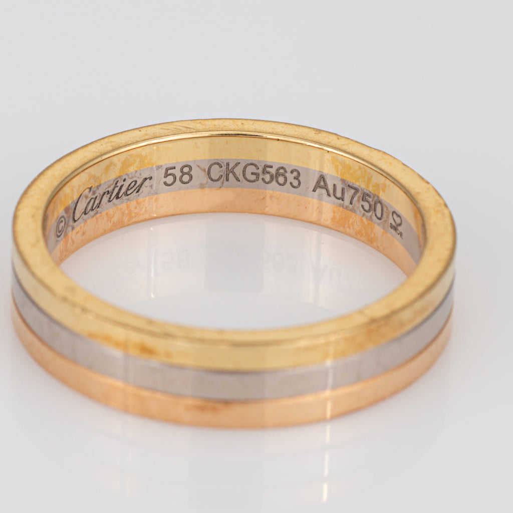 Metal & Hallmark: 18k yellow, rose & white gold. The ring is hallmarked "750" for 18k gold and "Cartier" along with the serial number and the ring size "58"