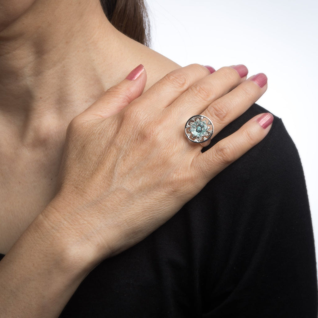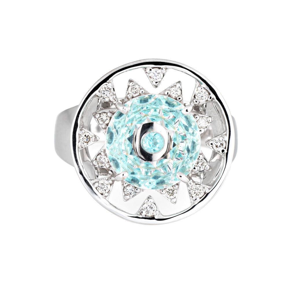 The Paraiba tourmaline is set upon a faceted white crystal that allows light to refract from the Paraiba, bathing the white crystal in a light shade of turquoise. An interesting optical illusion and unlike anything we have seen in jewelry design! Diamonds accent the center mount, set in triangular forms adding visual interest to the ring. The statement ring adds a nice pop of color on the hand. The medium rise ring (6.5mm - 0.25 inches) sits comfortably on the finger. Inspired by the vibrant culture, colors and people of Brasil, Vianna Brasil designs are exotic and beautifully detailed.