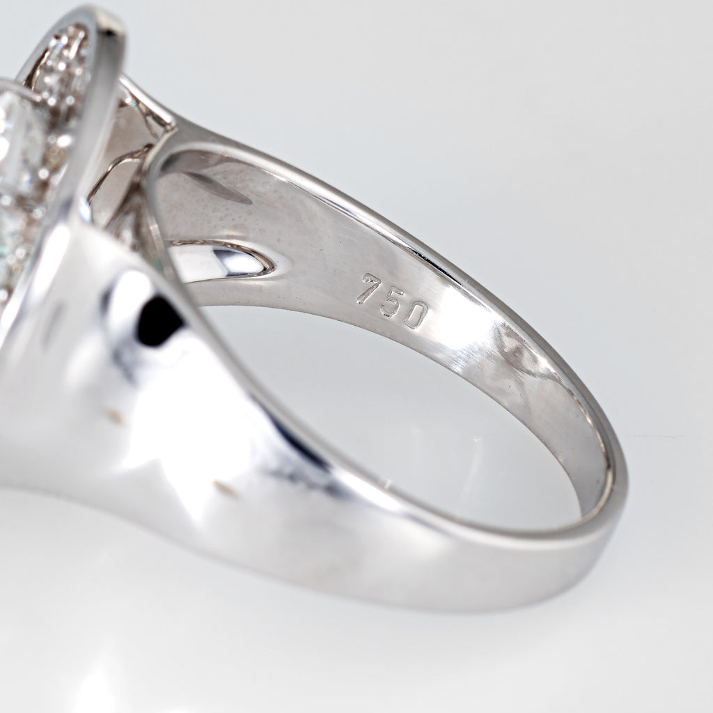 Metal & Hallmark: 18 karat white gold. The ring is hallmarked "750" for 18k gold.