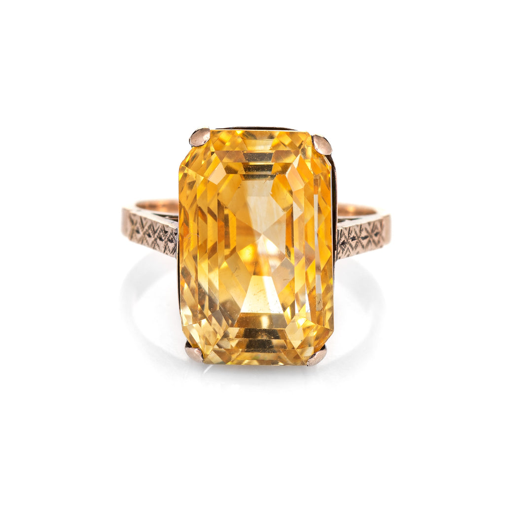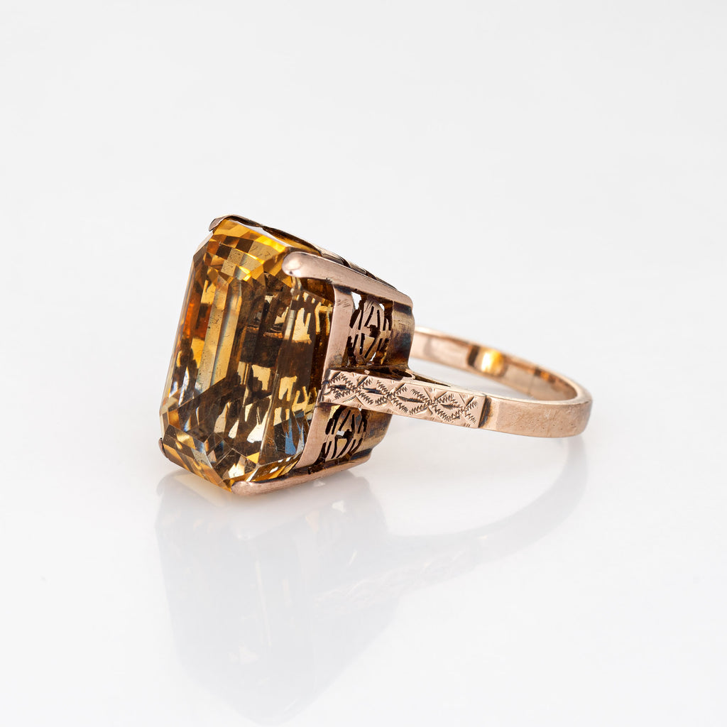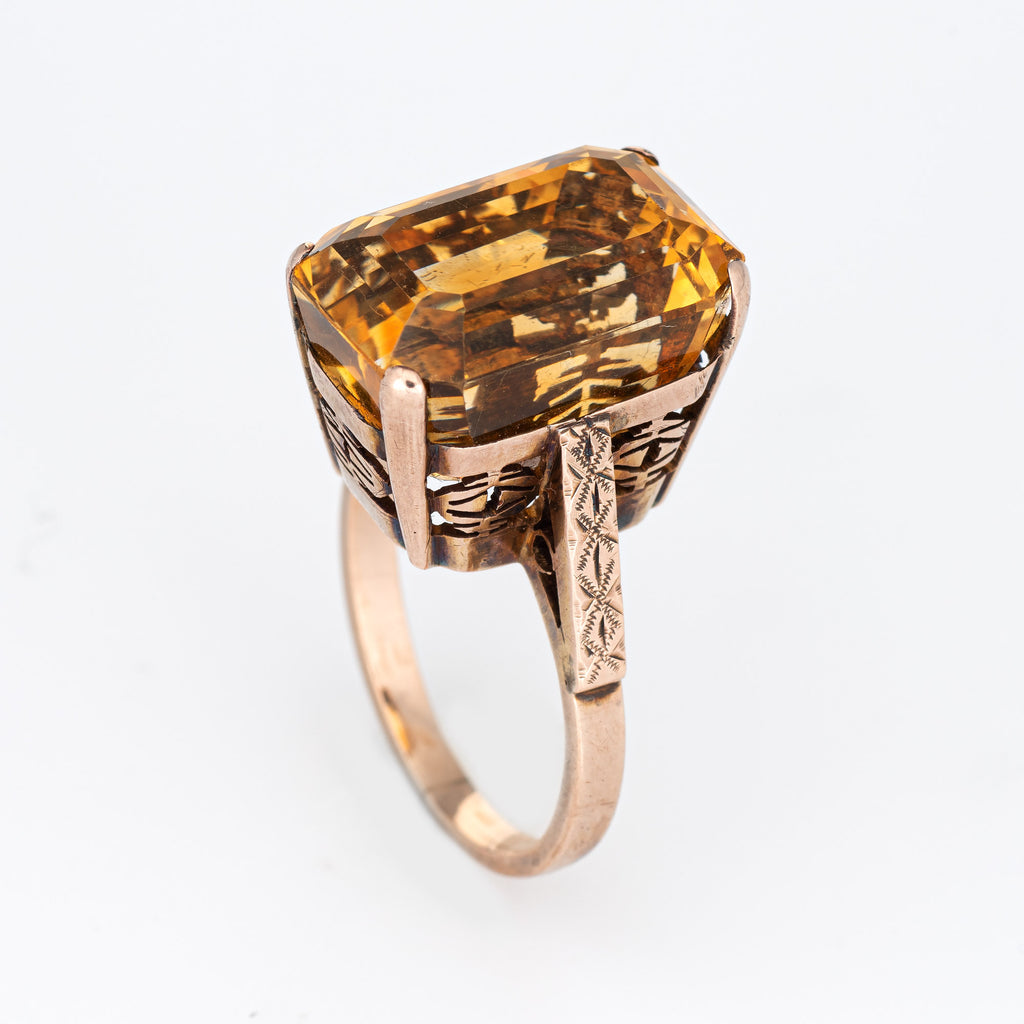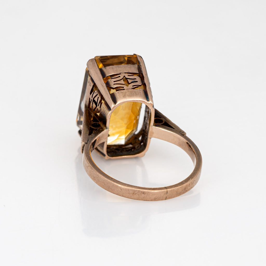 Stylish vintage golden citrine cocktail ring (circa 1950s to 1960s) crafted in 9 karat rose gold.