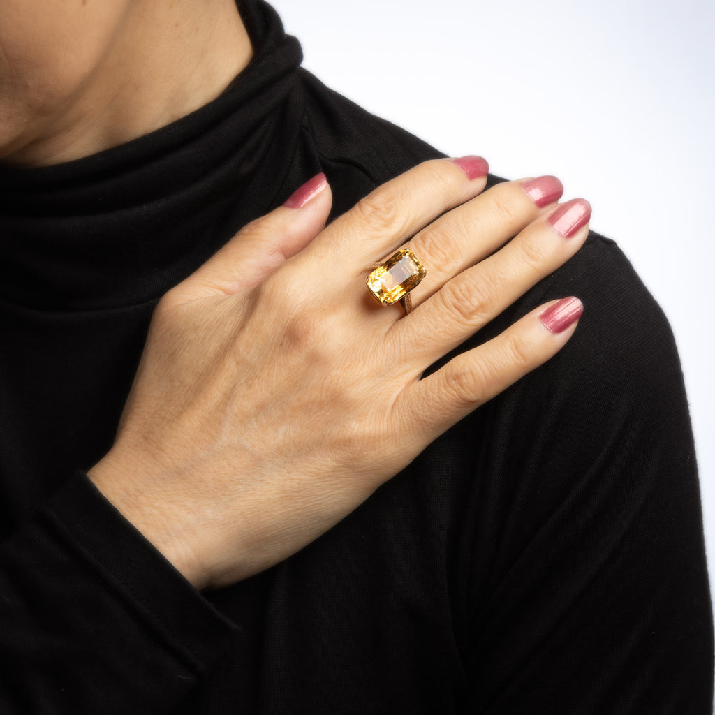 The step cut citrine glows in a golden tone, set securely into a four pronged mount. The statement ring adds a nice pop of color on the hand. The high rise ring (12mm - 0.47 inches) sits comfortably on the finger.