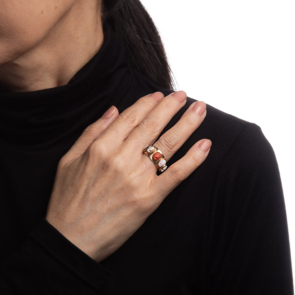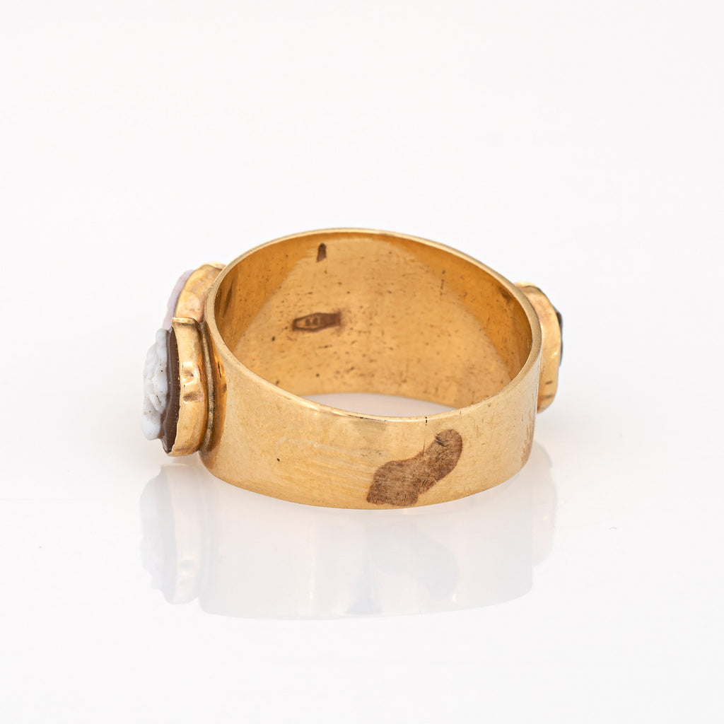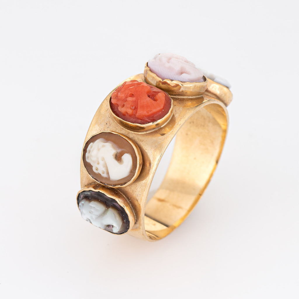The five cameo ring highlights the profile of a woman, carved in relief. The band is great worn alone or stacked with your fine jewelry from any era. The low rise ring (4mm - 0.15 inches) sits comfortably on the finger.