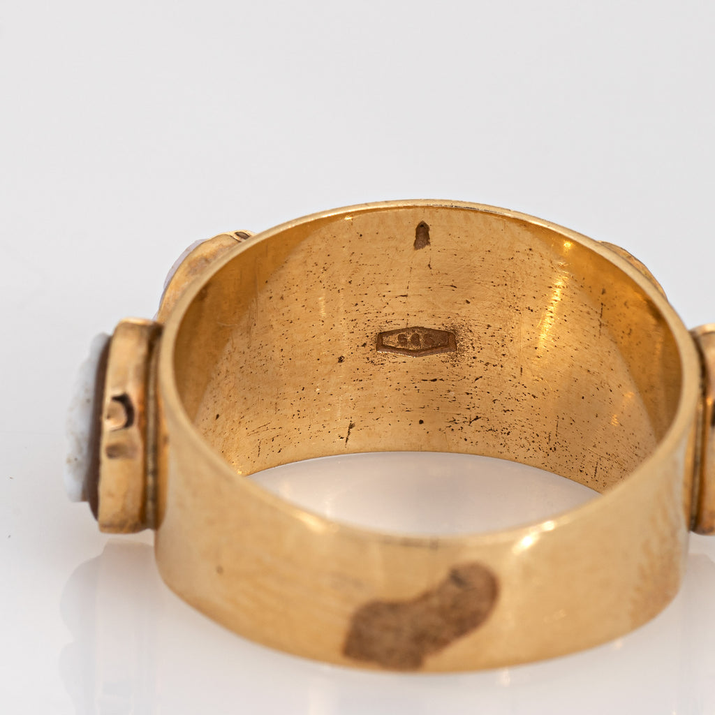 Stylish vintage five panel cameo ring (circa 1950s to 1960s) crafted in 14 karat yellow gold.