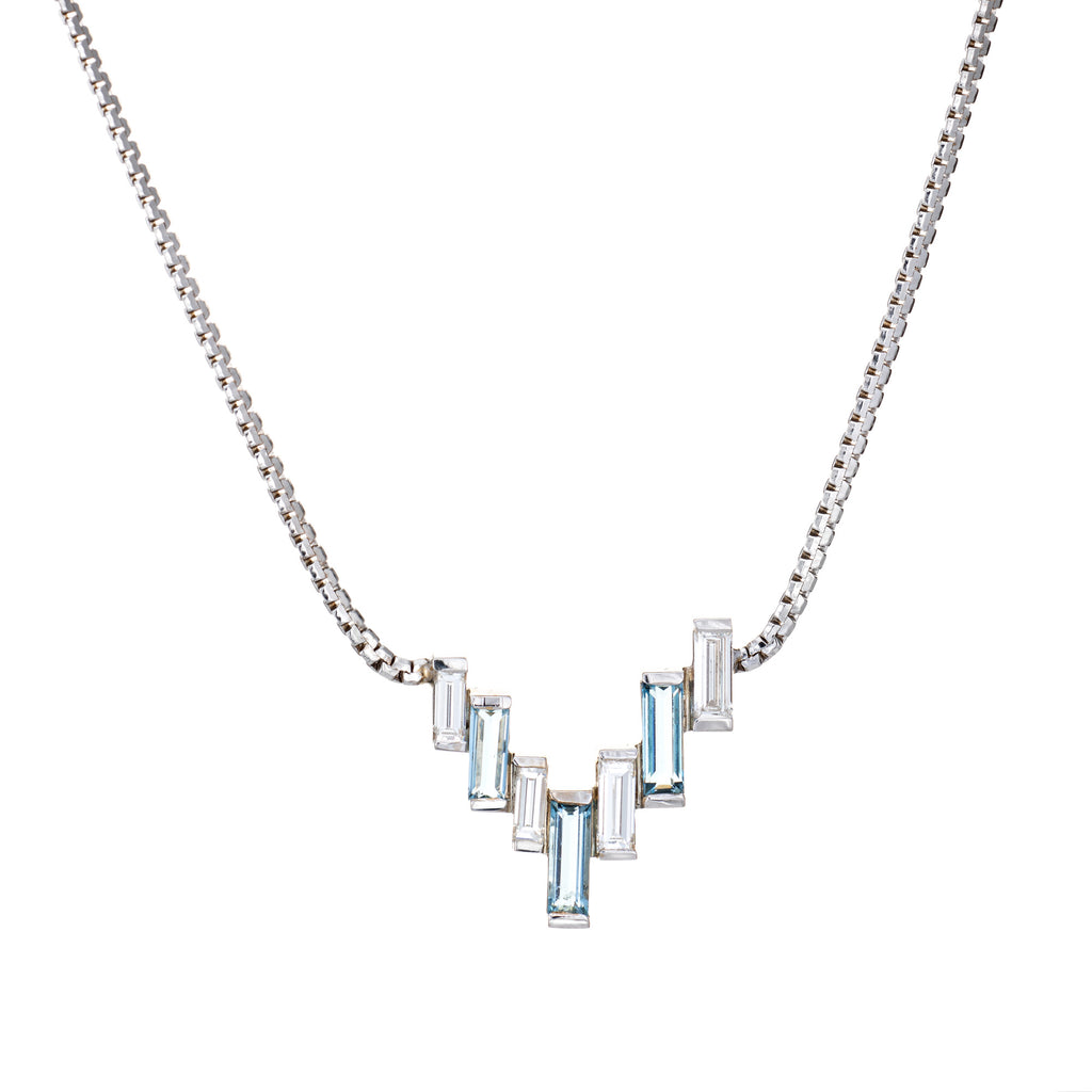 The striking necklace is set with bright sparkling diamonds and aquamarines in a cascading geometric form. The necklace measures 16 inches in length and is great worn alone or layered with your fine jewelry from any era.