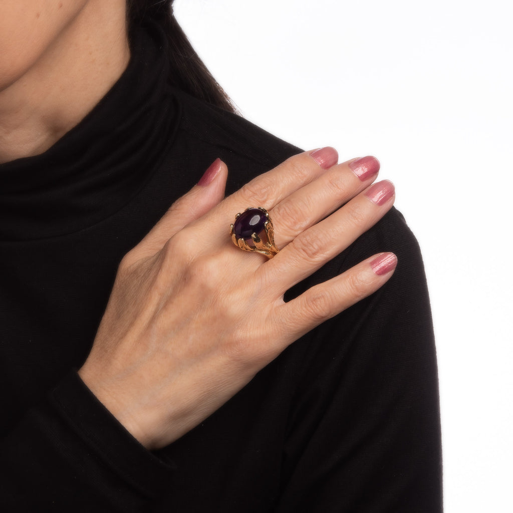 The rich royal purple amethyst is set into an abstract claw setting. Weighing 14.7 grams the ring has a nice heavy weight feel on the hand and makes a great statement. The high rise ring (13mm - 0.51 inches) sits comfortably on the finger.