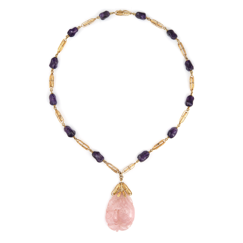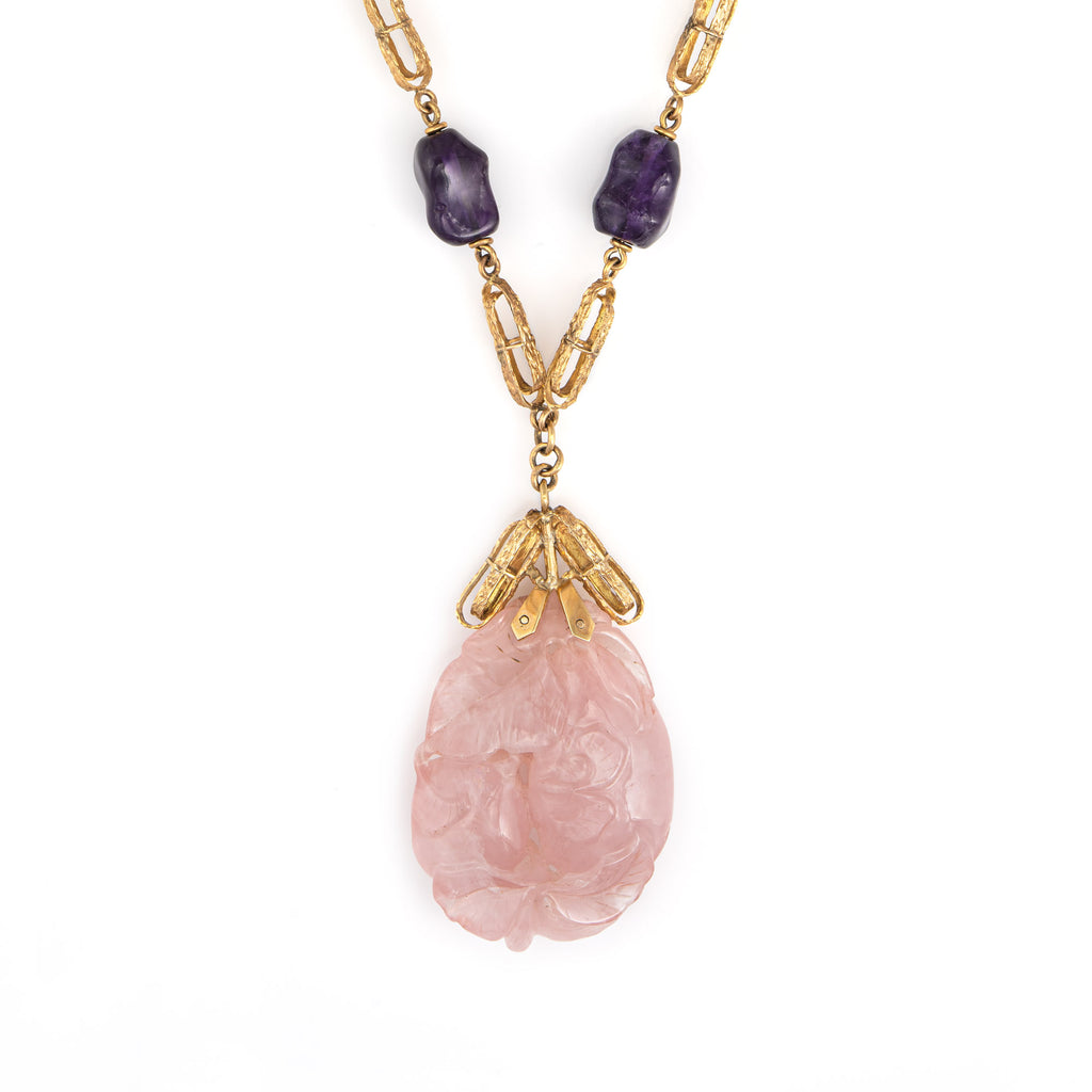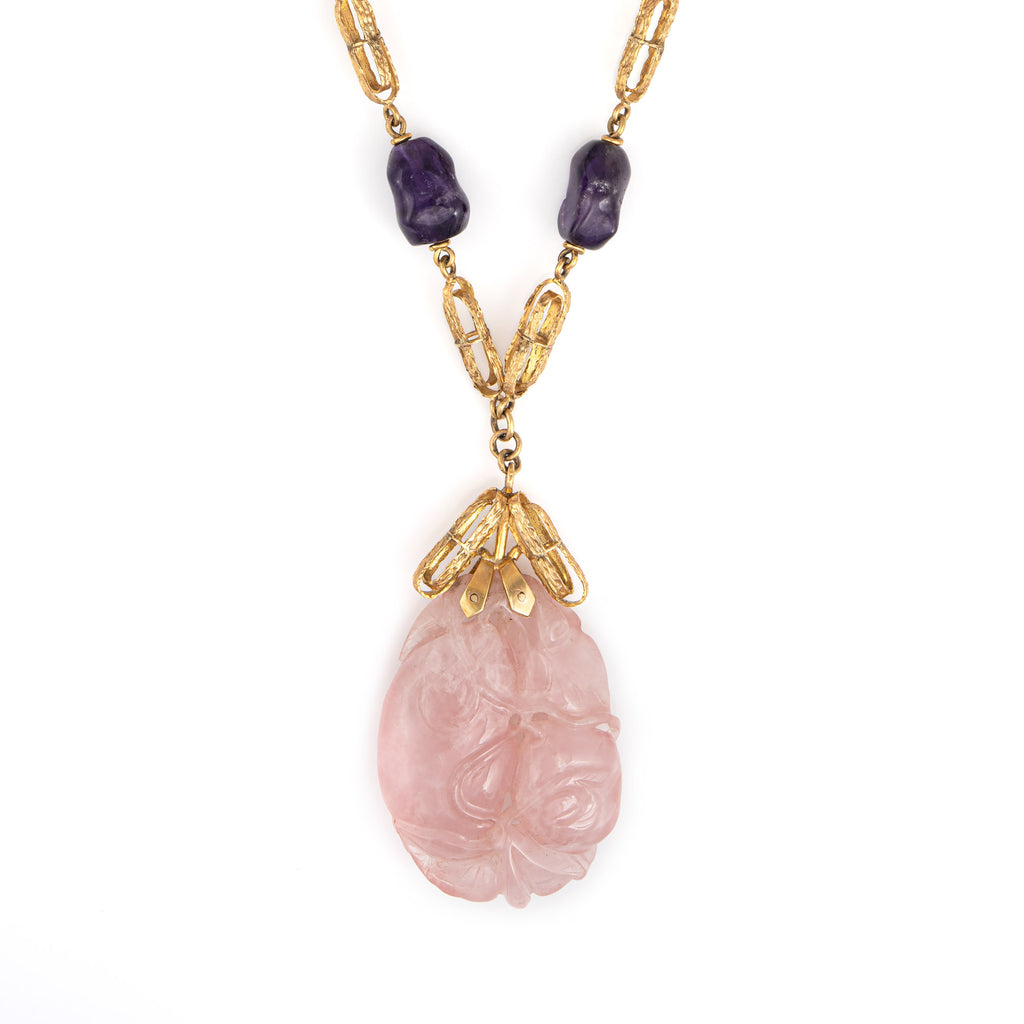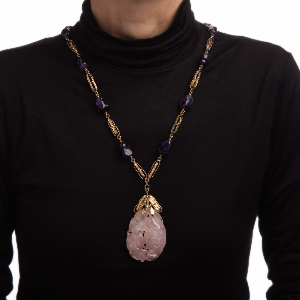 The stylish necklace features a large musky pink rose quartz pear shaped drop, carved in a botanical motif. Rectangular nugget style links with rich royal purple amethyst beads add color and texture to the strand. The long 25 inch necklace is great worn alone as a statement necklace or layered with your fine jewelry from any era.