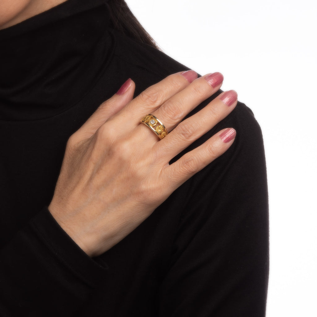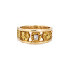 The band is set with five natural mined from the earth gold nuggets, with a diamond set to the center nugget. The gold nuggets glow in a rich buttery yellow color. The ring is great worn alone or stacked with your fine jewelry from any era. The low-rise band (3mm - 0.11 inches) sits comfortably on the finger.