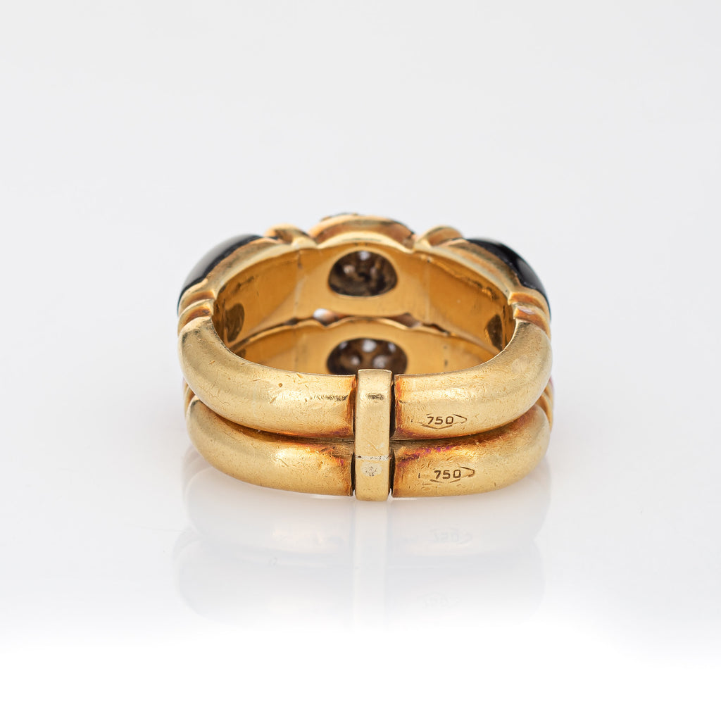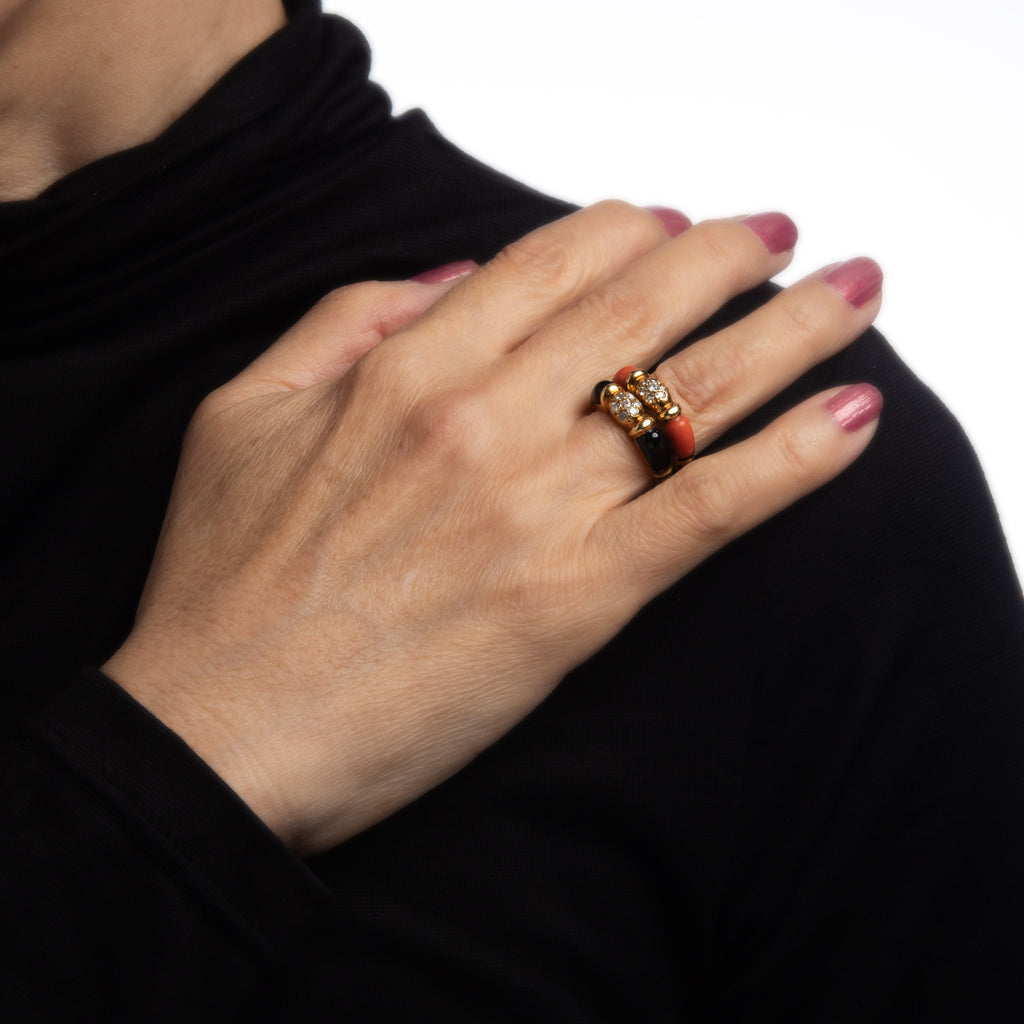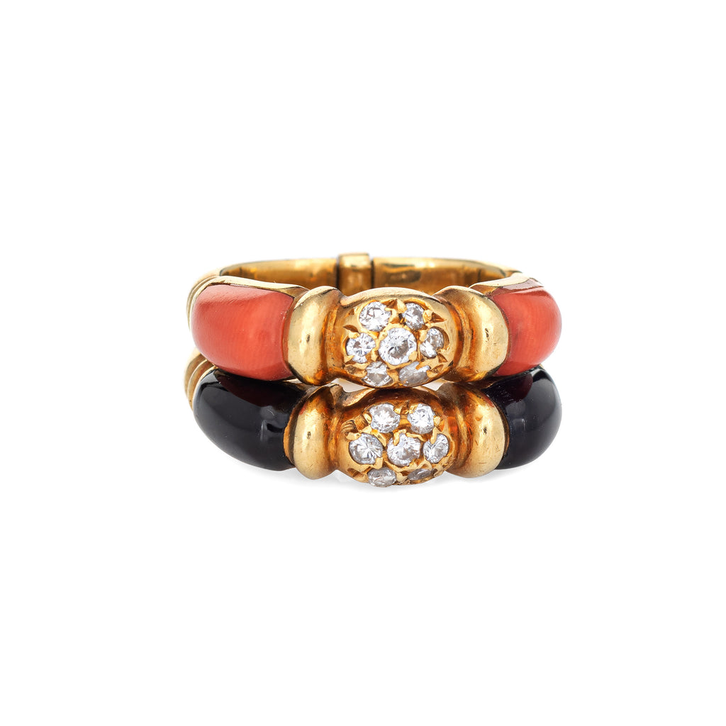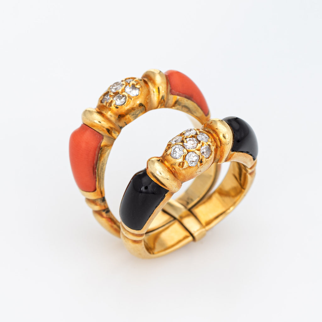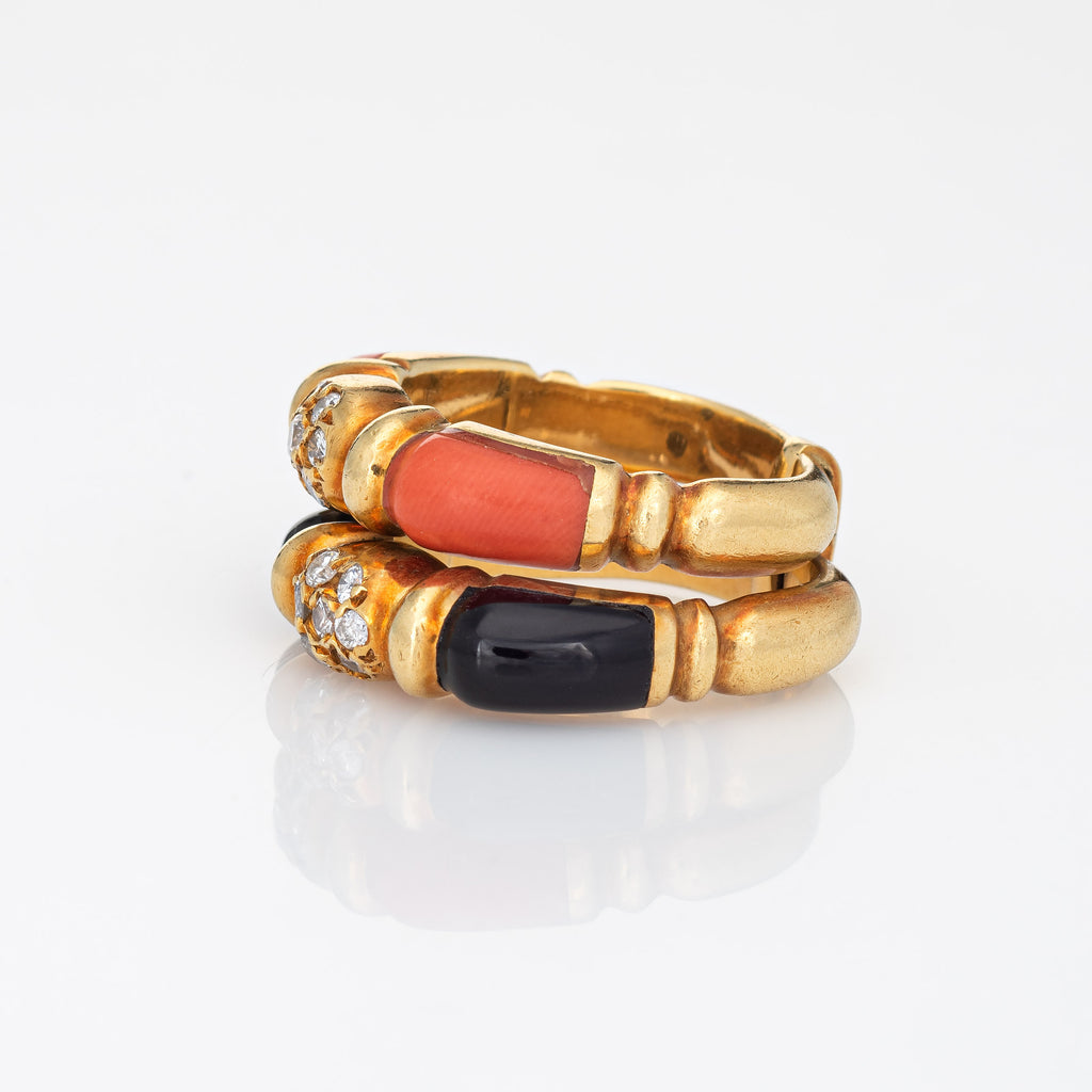Stylish vintage set of 2 diamond, coral & onyx rings (circa 1970s) crafted in 18 karat yellow gold.