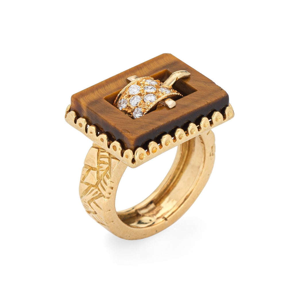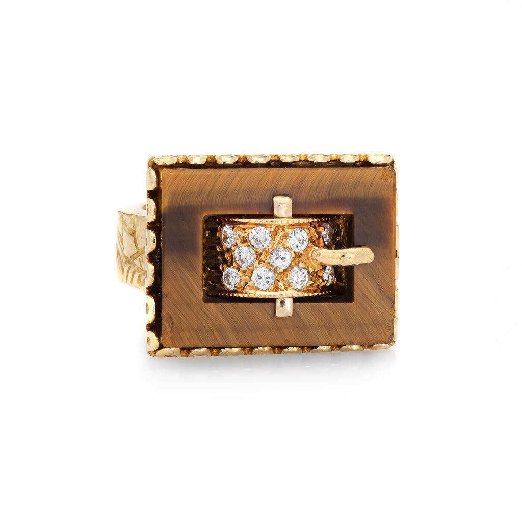 Stylish vintage tigers eye & diamond buckle ring (circa 1970s) crafted in 18 karat yellow gold.