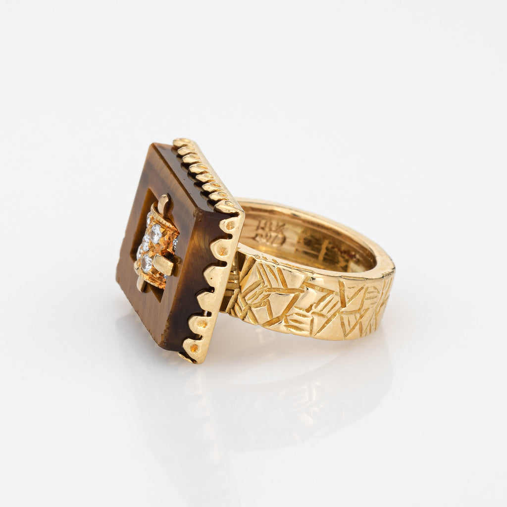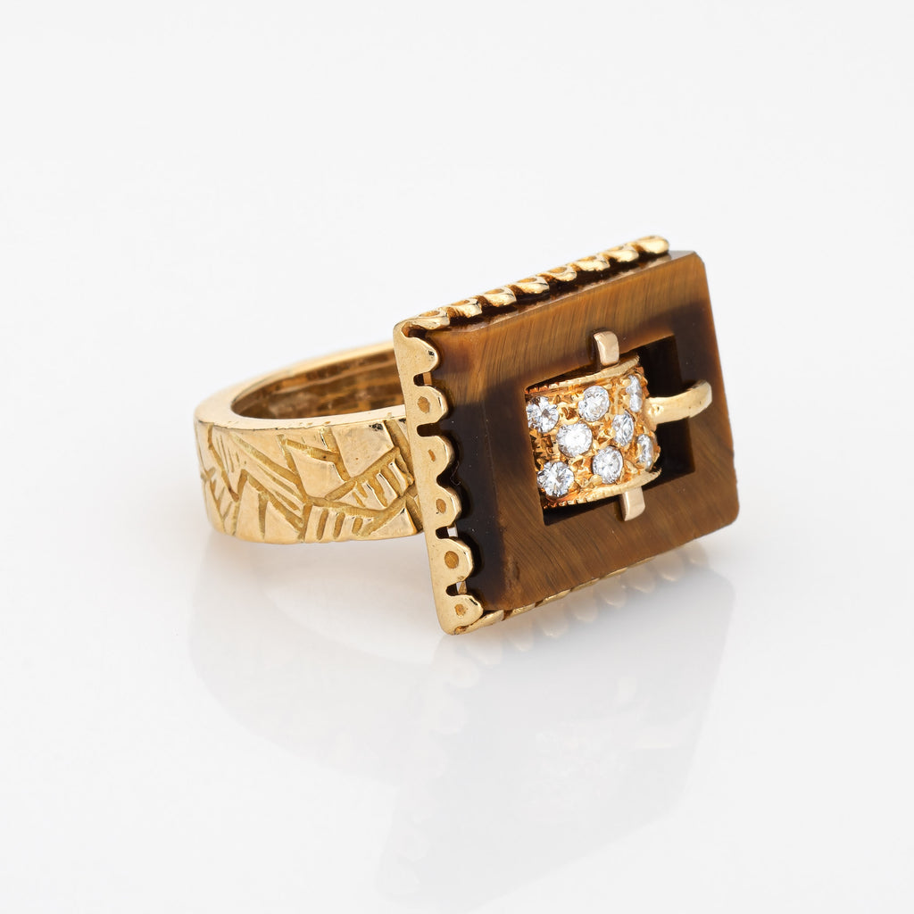 The striking buckle ring is set with diamonds to the center, framed with luminous tigers eye. With textured abstract detailing to the band, the ring is a great example of 70s era jewelry design. Currently a small size (3) the ring is great for wear on the pinky finger (the ring can be resized up approx. 3-4 sizes). The low rise ring (6mm - 0.23 inches) sits comfortably on the finger.
