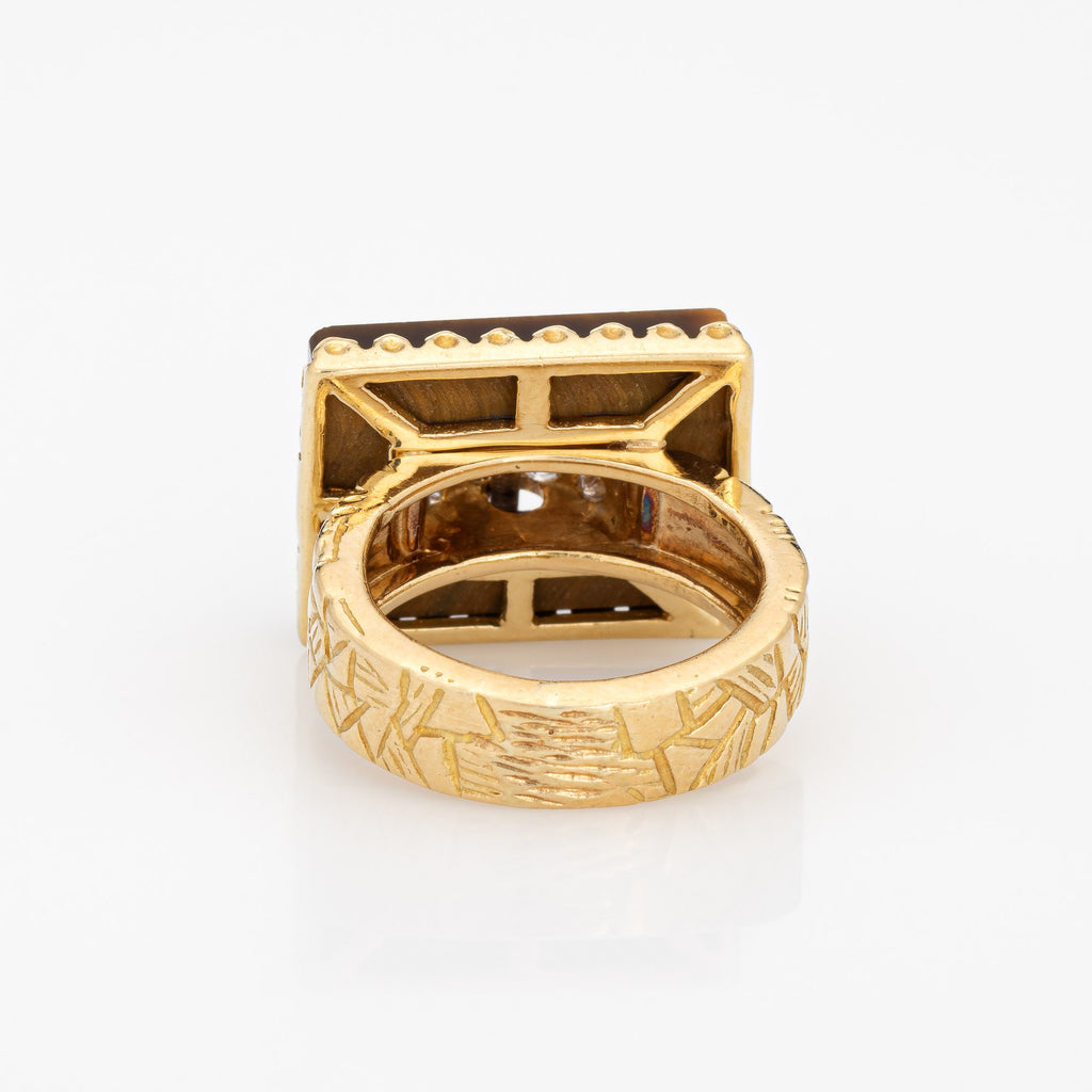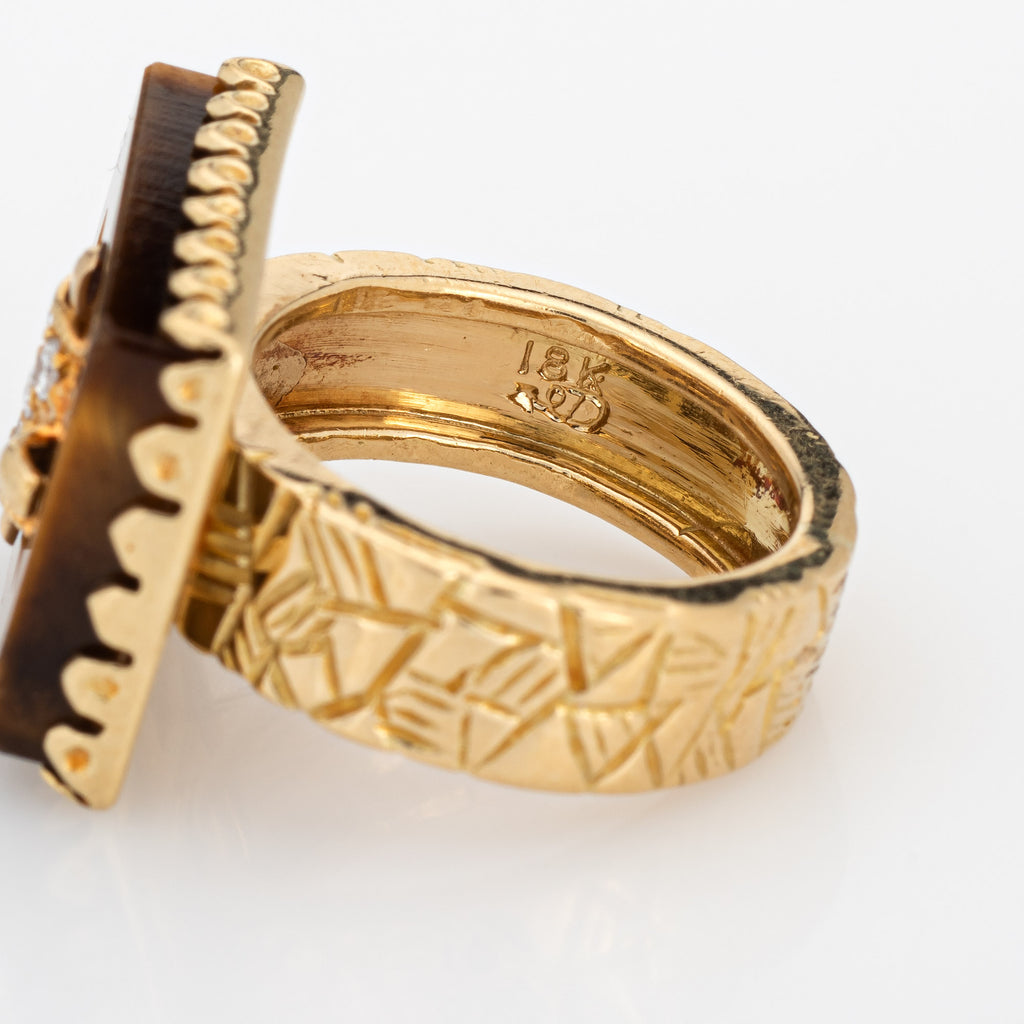 Vintage 70s Tigers Eye Diamond Buckle Ring 18k Yellow Gold Sz 3 Pinky Band