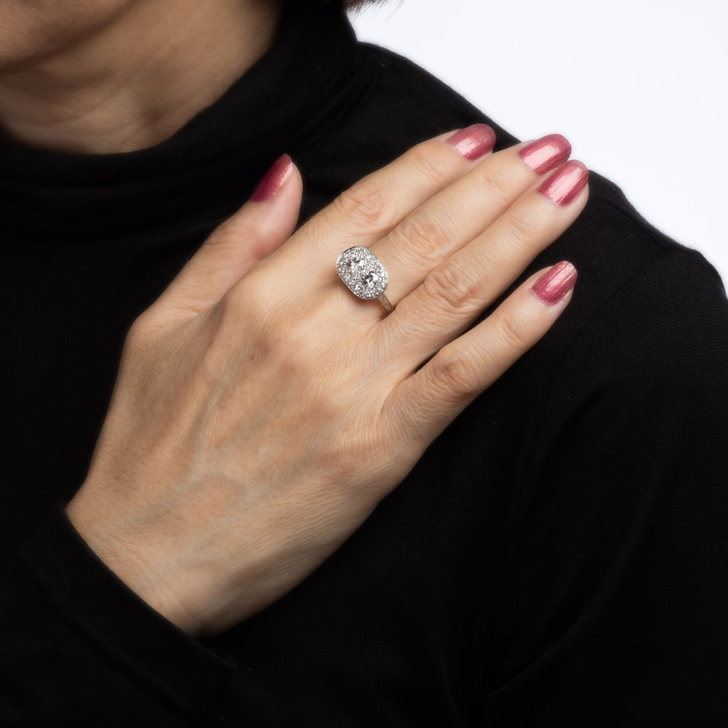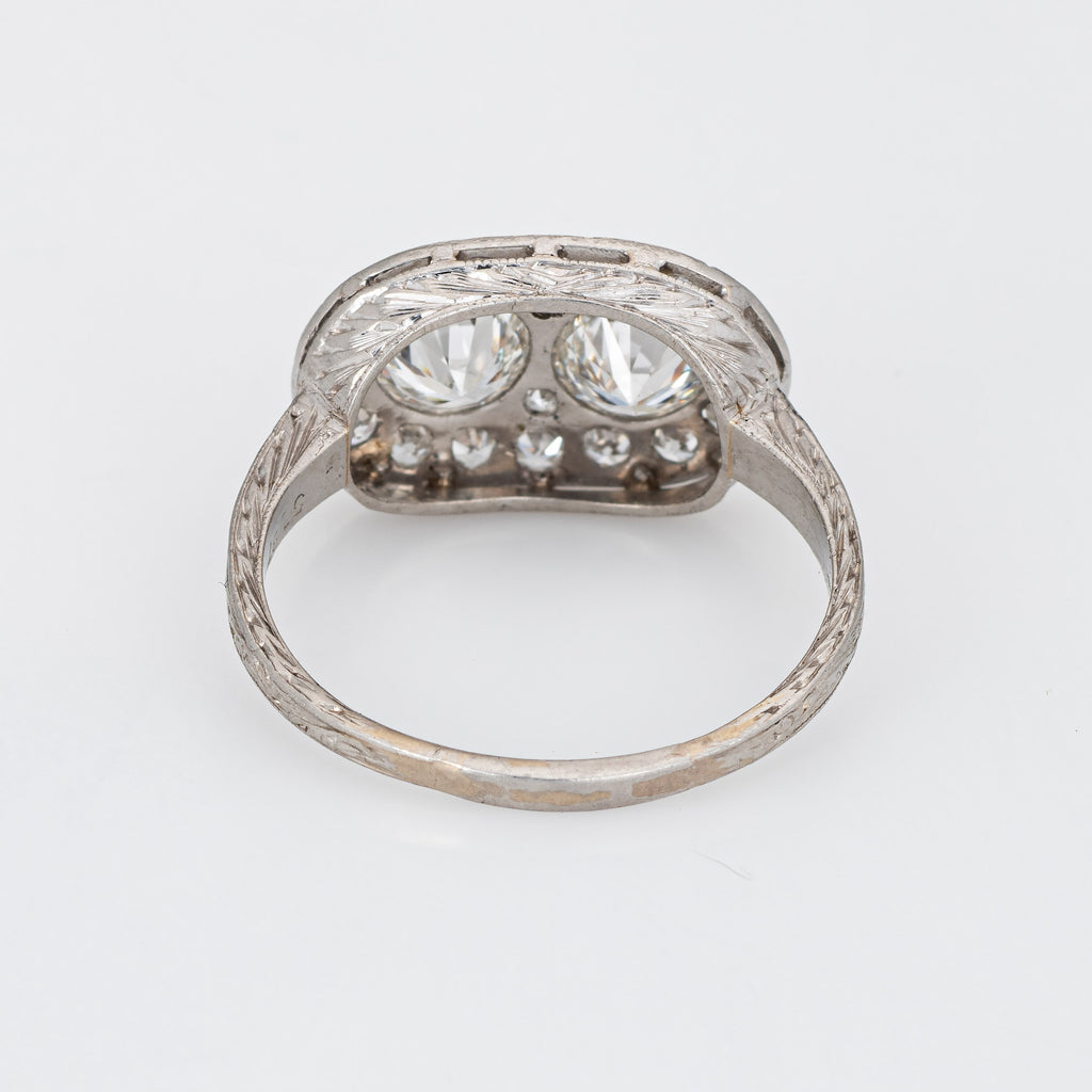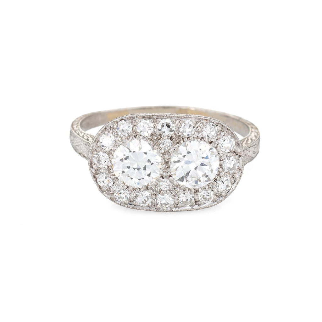 Stones: Two centrally mounted Old European diamonds are estimated at 0.60 carats each, accented with a further 16 single cut diamonds. The total diamond weight is estimated at 1.92 carats (estimated at G-H color and VS2-SI1 clarity).