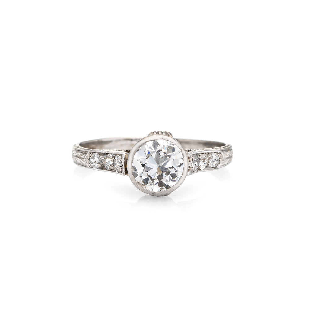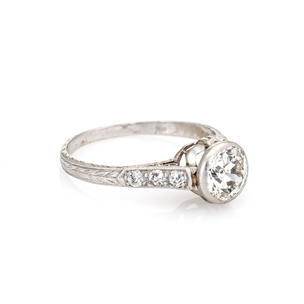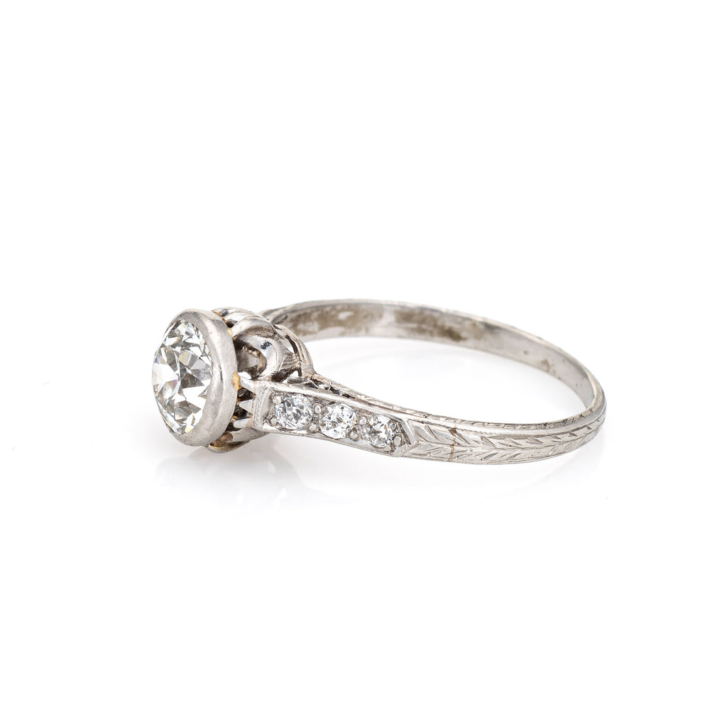 Stones: Centrally mounted estimated 1 carat old European cut diamond is estimated at I-J color and SI1-2 clarity. the side shoulders are set with six estimated 0.03 carat old European cut diamonds that total an estimated 0.18 carats. The total diamond weight is estimated at 1.18 carats.