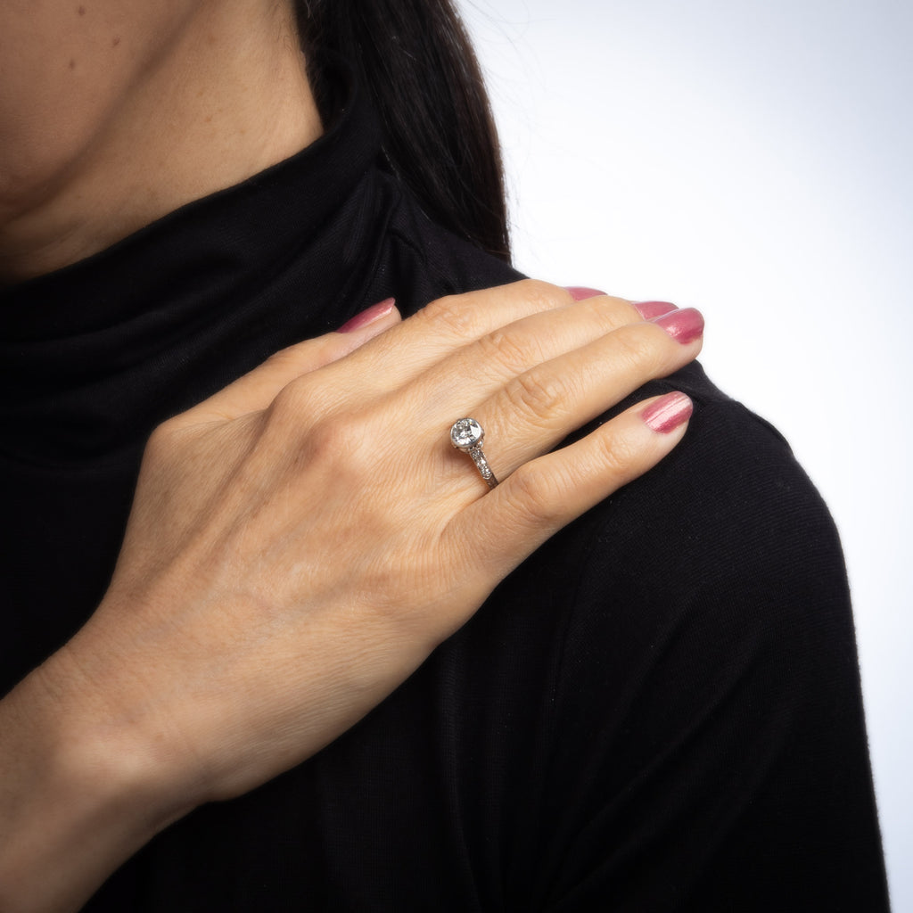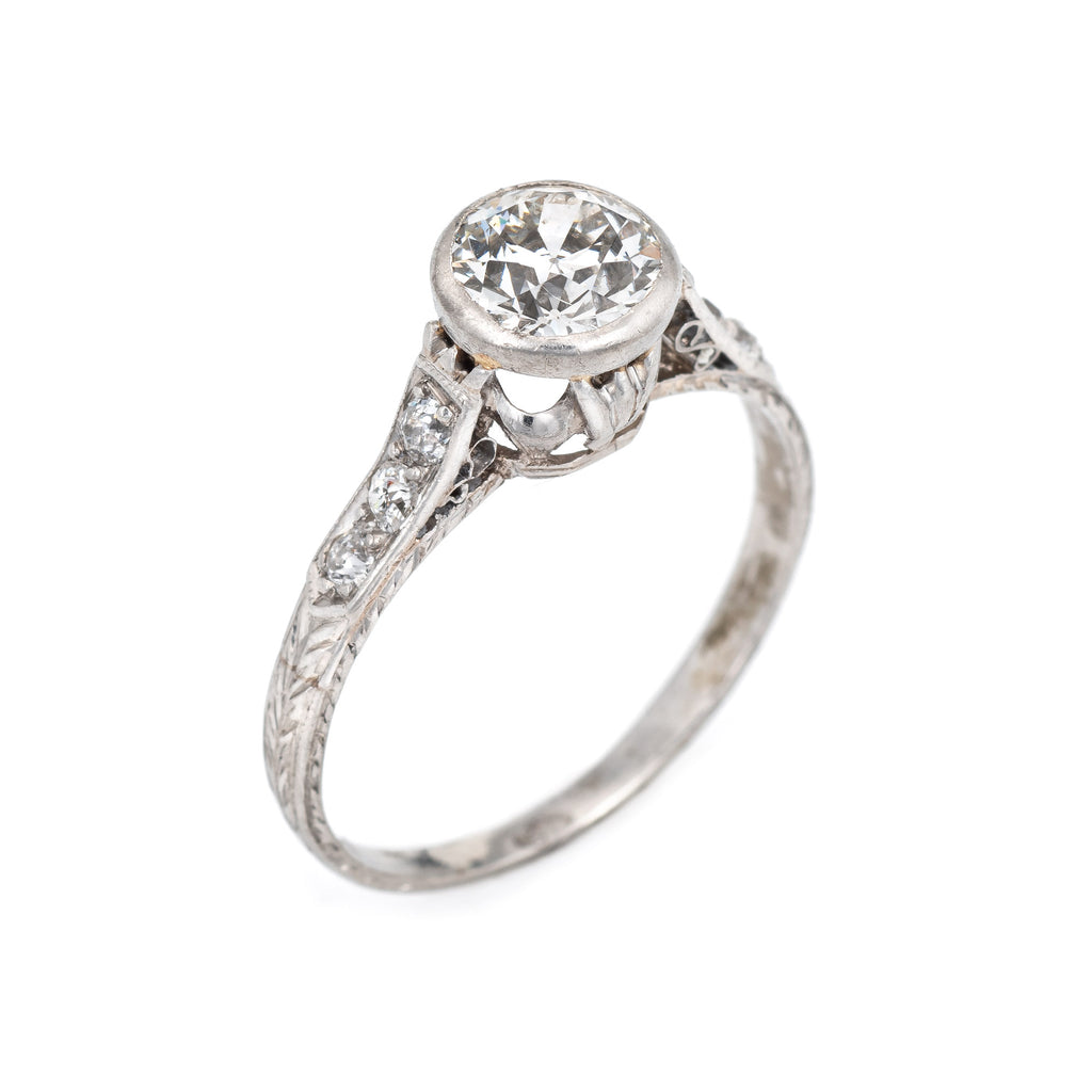 The center diamond is bezel set in a beautiful filigree mount with hand etched detailing to the side shoulders, a hallmark of the Art Deco era. The ring has a medium profile rising 7mm from the finger (0.27 inches). A lovely engagement ring or right hand ring for everyday wear.